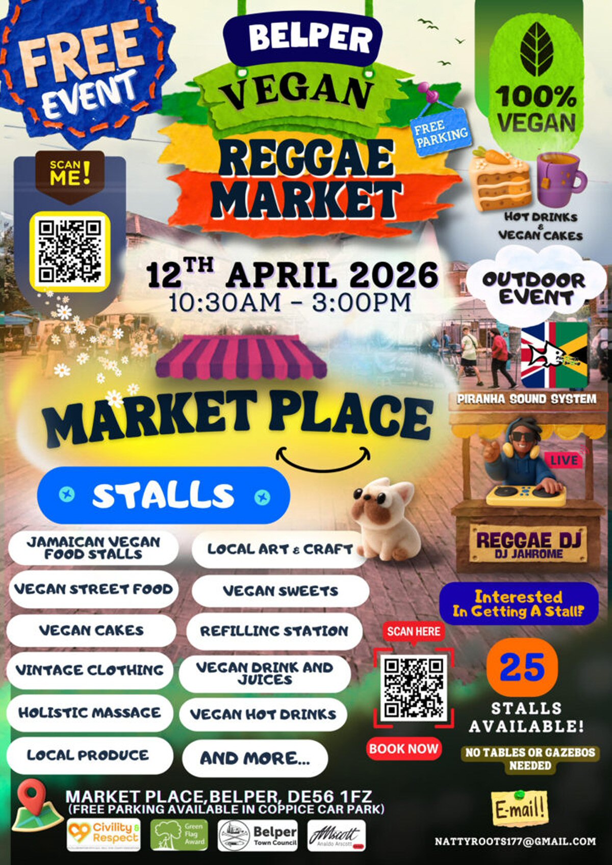 Starting off our Sunny Sunday Markets season for 2026 we welcome the Vegan Reggae Market to Belper Market Place.