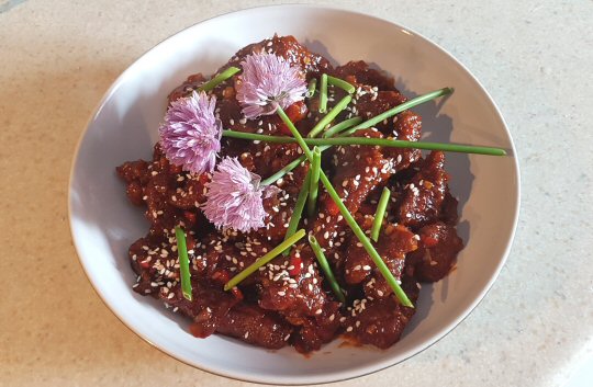 It wasn’t perfect, no surprise (I’m not gonna lie!);next time I need to slice my beef a bit thinner to get it uber-crunchy rather than crunchy in parts and semi-crunchy in others . The sauce however was bob-on, better than our local takeaway I reckon ;)!! I zhuzhed it up presentation-wise, to give it every advantage before His Nibs took his first bite; I figured if I could get him in a positive frame of mind to eat my cooking I’d pretty much won the battle.
