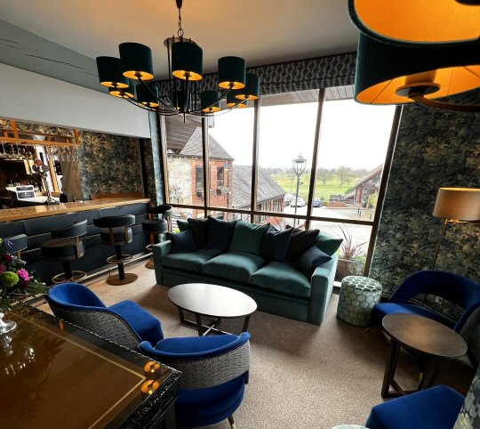 Earthy greens and neutral beiges combine with geometric patterns, textured fabrics, and natural wood finishes to add a modern yet timeless charm.Work has included new wallcoverings in the bar area and restaurant, along with curtains, carpets, seating and striking contemporary lighting fixtures, all chosen to enhance comfort and maintain the country-inspired feel.