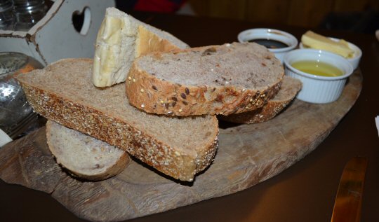 The Menu is pleasingly varied, with plenty of choice for meat eaters and vegetarians alike across all the courses. I was tempted by the Fried Whitebait (for which there is an additional £1 charge if you use the Groupon deal), but in the end we decided to play nicely and share a Bread Board Platter. Thick slices of Date and Walnut, Cheesy topped Tiger and Sourdough Breads were accompanied by little pots of lightly softened Butter, Olive Oil and Balsamic Vinegar, and was simply presented on a natural Wooden Platter. The bread had been warmed and we tucked in with our usual gusto.