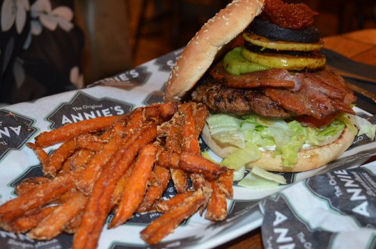 The Man Bird and I were playing taxi service for our Chick and one of her friends (they were going to see Nicki Minaj at the Capital FM Arena), so we decided to make our own fun and have a meal and drinkies to while away the hours. Having been to Rub earlier in the year we fancied somewhere different, and found ourselves at The Original Annie’s Burger Shack. The premises themselves are a great fusion of modern industrial and homely charm with exposed brickwork and modern lighting sitting comfortably alongside bunches of Dried Hops. Pale Sage Green paintwork creates a further relaxed feel to the premises, and padded seating around the periphery meant we were going to have a really comfortable dining experience.