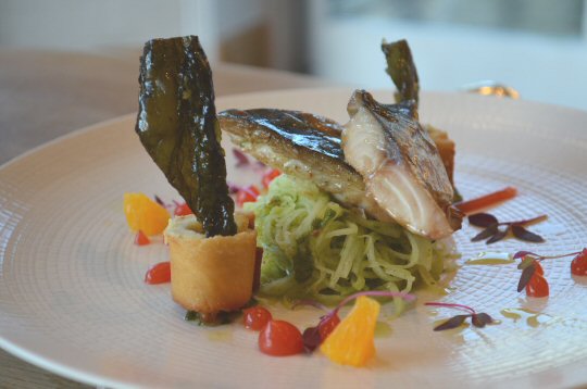 The main menu, redesigned for spring by Chef Patron Alan Hill and his team, comprises six equally tempting starters and it took The Man and me a fair few minutes and several changes of mind to choose our selection. Eventually I went for the Asian soused Cornish Mackerel fillet with Blood Orange, aromatic Mooli Slaw, Crispy sea salt Seaweed and rolled Prawn Toastie and His nibs had the 48 hour slow cooked Derbyshire Corned Beef Terrine with mustard seed Sauerkraut, Scotch bonnet and Plum Tomato Chutney on Brioche. Our waitress came and placed a bottle of chilled water on the table, and a basket of bread for us to graze on.
