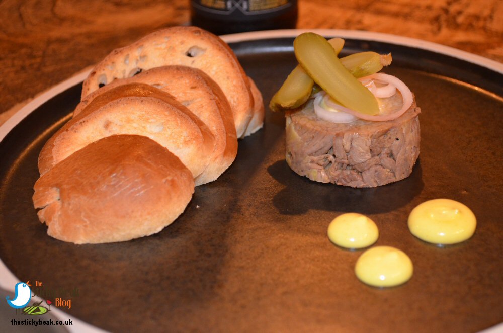 With the ordering formalities dispensed with we sat back and settled in, chatting and catching up about the week we’d had, and it wasn’t long before our starters were being placed before us. Our lovely server had arranged additional cutlery for our starters, so everything was in place for us to go ahead and enjoy, other than deciding which butter to have with the bread – we chose the Smoked Paprika version. Literally a nano-second after he’d taken the first mouthful of his potted Beef Brisket, His Nibs let out a gentle sigh of contentment and grinned happily.