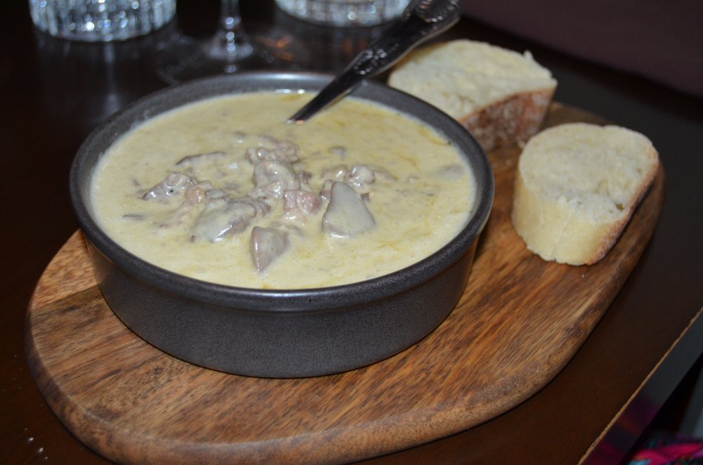 For starters we ordered Soup of the Day (Onion, Celery and Potato – for Daddy Bird), Chicken Livers and Pancetta in Cream, Brandy and Garlic sauce (mine), Tomato, Mozzarella and Rocket Salad for Mummy Bird, Prawn Cocktail for Chickadee, and Meatballs in Tomato and Garlic sauce for His Nibs.