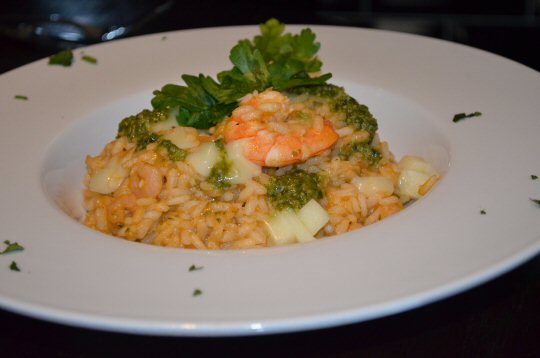 For our main courses we had a Margarita Pizza, Ravioli al Granchio (Crab and Spinach Ravioli), Pizza Carne Fiesta - with extra fresh Chillies and Risotto Gamberoni (King Prawn Risotto). I should just clarify that the Risotto is not included in the discounted offer. As with the starters the pizza base was lovely and crispy and there was a great amount of toppings to both of them. My Chick said that her risotto was really tasty; there was a pleasing amount of Prawns in there, the rice was creamy and the seasoning was just right. The Ravioli was cooked superbly with the pasta al dente and had abundant filling in it. We were also offered Parmesan cheese and Olive Oil to accompany our food, and the Boy accepted some Parmesan for his Pizza.