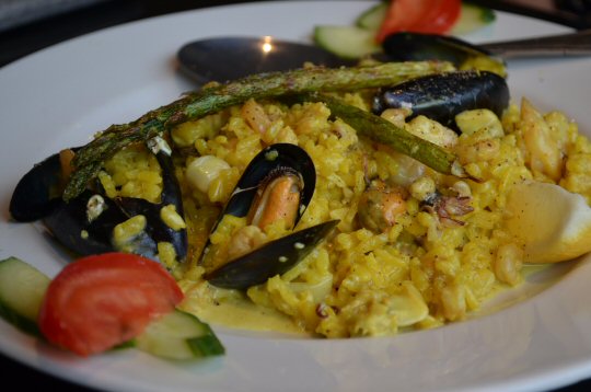 For our main courses we went for the classic dish of Tagliatelle Carbonara (Bacon, Egg yolks and Cream with Parmesan cheese) and Risotto Milan (luxury seafood mixed with Onions). Both dishes were of a very pleasing portion size and were absolutely piping hot; you could see steam billowing from the tops of the dishes. We were offered Parmesan cheese and fresh ground Black Pepper to accompany our meals. I accepted the Pepper and His Nibs had extra cheese sprinkled over his food.