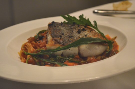 The staff are very discreet but at the top of their game because they must have been observing us eat and given the go ahead to the chef to start cooking our main courses as they arrived after only about 5 minutes of us finishing our starters, and there is no way either dish could have been prepared in that time. It will come as no surprise to know that I chose North Sea Bass with Tomato Linguine, Clams, Smoked Anchovies and Capers for my main course as I do love Fish and Seafood. Stuffed Chicken with Charred Leeks, Butter Bean and Chorizo stew was the Boy Wonder’s order, and they both looked extremely tasty as they were placed in front of us.