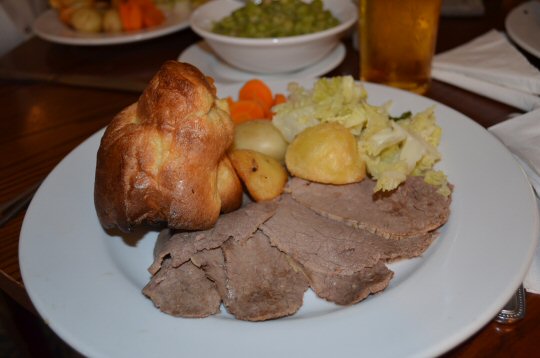 We chose 3 different meats for the roast; Lamb, Pork and Beef and they were all beautifully cooked. Each meat was superbly moist and flavoursome, sliced quite thinly and there was a very generous amount on each plate. The accompanying Savoy cabbage and carrots were perfectly cooked with just a hint of their natural crunch remaining, the new potatoes were packed full of taste and the roast potatoes had lovely fluffy insides with amazingly crispy outers. Mushy peas were in a separate bowl, as was the meaty gravy. The homemade Yorkshire puddings were nice and light, not at all claggy, and they were a fantastic size. The chef came into the dining area and went round each table asking if everyone had enjoyed their meals, which was lovely to see. As you know, we have fairly hearty appetites dear reader but even we were impressed by the huge plateful of food you got.