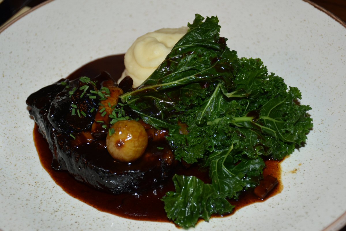His Nibs had chosen the Braised Brisket of Beef with Bourguignon sauce, Celeriac Purée and Kale for his main course and (as with my meal) there was an extra jug of sauce for him to help himself to, ad lib. The beef brisket looked like a steak, it was so thick, and had a marvellously deep flavour to it that had him grinning with delight. Thanks to Chef’s skill in the kitchen, the meat was uber-tender and fell apart at the merest touch from the knife. A glass-smooth purée of Celeriac provided the perfect subtle contrast to the richness of the beef, lifting things a little on the palate; its pale colour also stood out against the dark tones of the brisket. The al dente Kale was beautiful, its deep verdancy posing proudly on the platter; taste wise, this vegetable was superbly earthy in flavour - which suited the intense taste of the beef – and it wasn’t tough or chewy because young leaves had been used. Both of us dipped our fingers into the jug of sauce and were just discussing whether it would be unseemly if we asked for some bread to mop it up with when one of the team came along to clear away the clean plates! Moral of the tale; Be quicker off the mark!