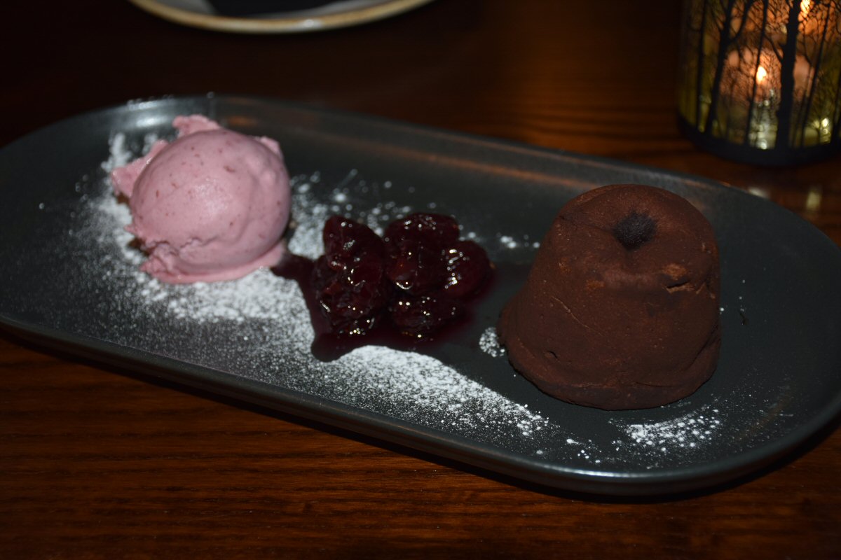 His Nibs’ Chocolate Fondant seriously couldn’t be more cocoa-y if it tried! Chocoholics will literally think all their Christmases are about to come at once with this superstar. The light spongy outer delivers a robust enough cocoa punch to have you on the dessert ropes, but the molten, puddly middle will knock you clean out with its intensity. There was a smattering of drunken Cherries nestling up against the fondant (which The Man loved!), so it was down to the cool, crisp Cherry Sorbet to bring His Nibs back to his senses. If the DeLorean was available we’d definitely have been using it on this particular evening!
