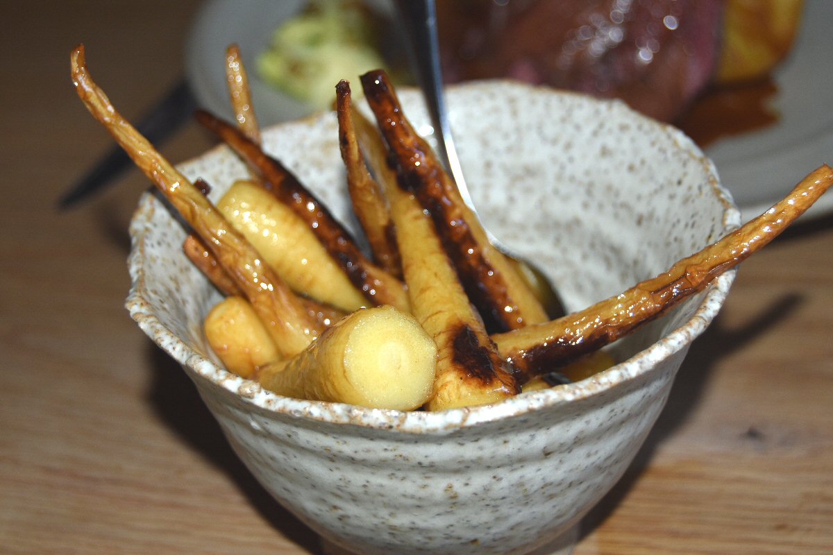 A single, large carrot half graced each of our plates and the beef fat’s twang permeated the softened root vegetable so that a gentle hint of it lingered in our mouths. My beloved Cauliflower Cheese came in a separate dish and as I gobbled it up, the mature cheese’s tanginess hop-scotched over my palate followed by the subtle flavour of the Cauliflower florets.