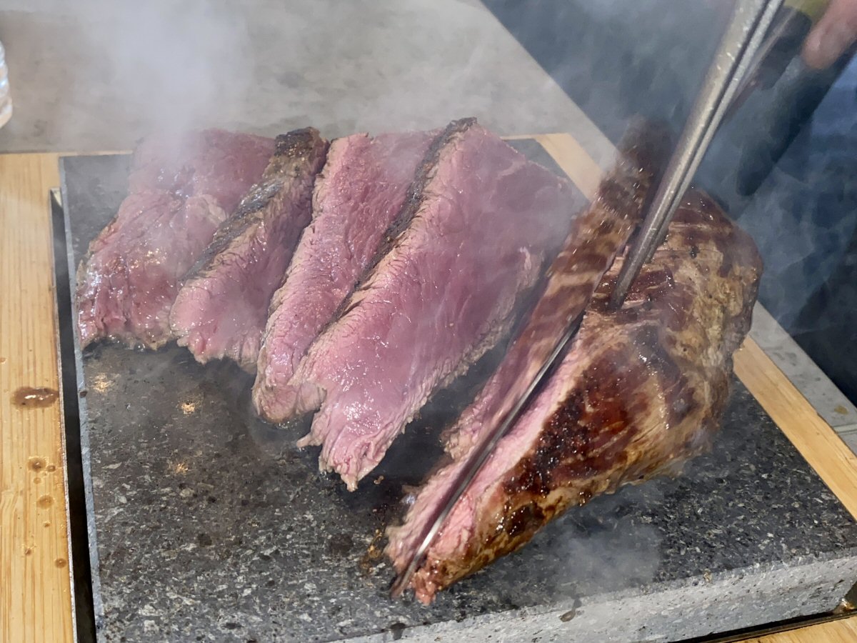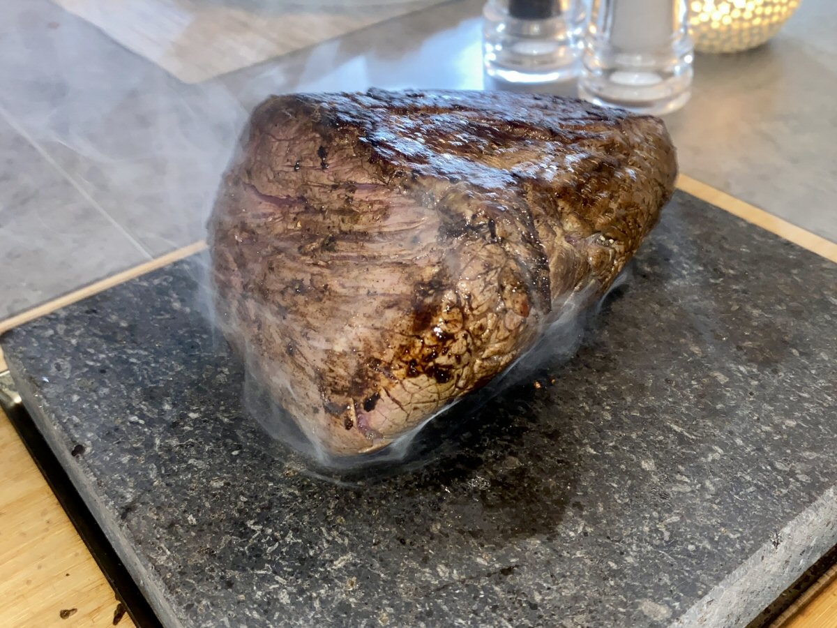 Clearly, we weren’t the only ones taking advantage of The Galleon’s banging steak offer, and the smell of cooking meat wafting over the restaurant from the open kitchen in the corner had our mouths watering in anticipation! It wasn’t long until our Chateaubriand was winging its way over to us, sizzling away on the super-hot volcanic stone that we’d use to finish cooking the meat to our liking π. A dapper chap came over with his knives and began to slice the steak for us (a nice touch, I thought) and informed us how to carry on with the hot stone - needing no further encouragement, we dived in!