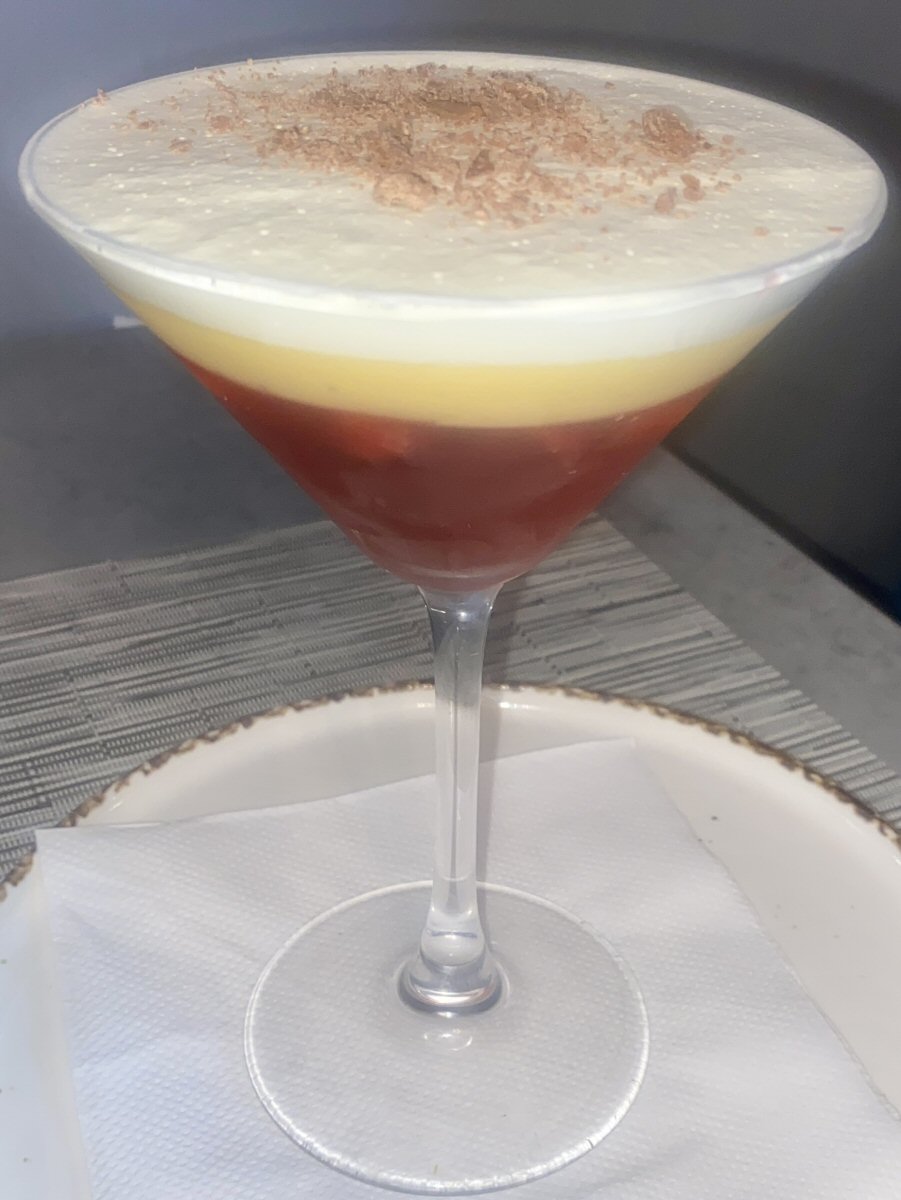 Throughout the meal, the presentation of all our dishes had been excellent, but my Trifle (in its cocktail glass) took the prize on this occasion π. I took a moment to appreciate its beauty, and the three distinct layers of Fruit and Jelly, Custard and Whipped Cream, before grabbing my spoon and breaking the surface of the dessert. Trifle fans will know exactly where I’m coming from when I say that the squelch elicited by my spoon was certainly audible; when I was young, I used to exclaim that the trifle had just ‘farted π!