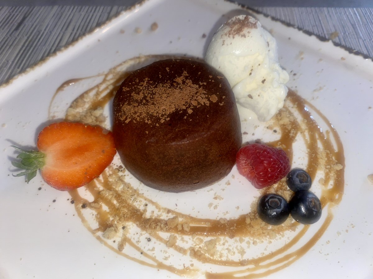 His Nibs was a totally smitten-kitten as soon as he clapped eyes on the dark, cocoa-rich outer of the Chocolate Fondant, but when he pierced the outer and the liquid inner unleashed its ravishing charms, he was mesmerised! It can sometimes be the case that desserts don’t taste as good as they look – and there’s no denying that that was going to be a tough job on this occasion – but the look of total rapture on The Mans’ mush told me that it was mission: accomplished π.