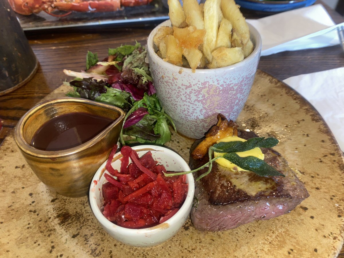 Well, the room may be a bit small, but the food certainly isn’t; what a meal!! The lovely Holly (our server for the evening) showed us to our table and swiftly got our drinks sorted: pint of Tennants for The Man (it was the only draught lager available) and a pint of Thistly Cross Traditional Scottish Cider made by cider artist Peter Stuart, for me. We turned our attention to the menu, and there were so many dishes that caught our attention that it took us a good 5 minutes to whittle choices down to a couple! Eventually I settled on the Langoustines to start (£13.95) followed by a whole, small Lobster (£36.50), and The Man went for Wild Pheasant to start (£9) and Wild Local Venison Haunch for his main (£21).