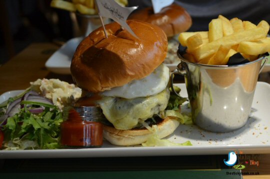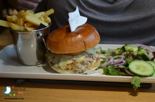 After much deliberation we decided to keep it fairly light as we have got a big lunch tomorrow with the Tribal Elders planned; I opted for the BBQ Chilli Pulled Pork and Mature Cheddar cheese hot Sandwich which comes with a bucket of chips and 2 beer battered Onion Rings. His Nibs plumped for the Mighty Morley Burger with Bacon, Cheddar, Onion Rings and Fried Egg.