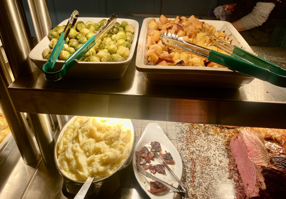 Elmer pops a Yorkshire Pud on your plate if you want one, then you saunter down the counters to help yourself from Sage, Onion and Cranberry Stuffing, Roasties and Mashed Potato, Cauliflower Cheese, Cheesy Leeks, roasted Swede cubes, roasted Carrots and Parsnips, Brussels Sprouts, Garden Peas, French Beans and spiced Red Cabbage…oh, and Elmer’s Onion Sauce (which is super-tasty). At the end of the counter is a huge pot of gravy and every sauce known to man! Needless to say, by the time we had made our way along all the meat and vegetables, and gone back to our seats, we looked like an episode of Man Vs Food!!