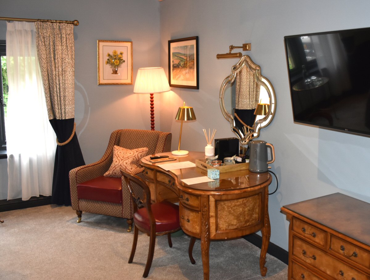 Opening the door, we feasted our eyes on a spacious, super-stylish interior that exuded a refined calm; instantly, our worldly cares slipped away. A welcome pack with a pamphlet of short, local walks and a box of Handmade Chocolates were in a prominent position on the writing desk; another touch that makes you feel cocooned in The George’s embrace. Whilst it may be subtle and unobtrusive, every mod-con is at your fingertips: large smart TV, pod coffee machine, kettle and selection of tea-bags, large wardrobe (complete with shelves for folded garments), and – oh! be still my beating heart! – a deep bath with rainfall shower over.