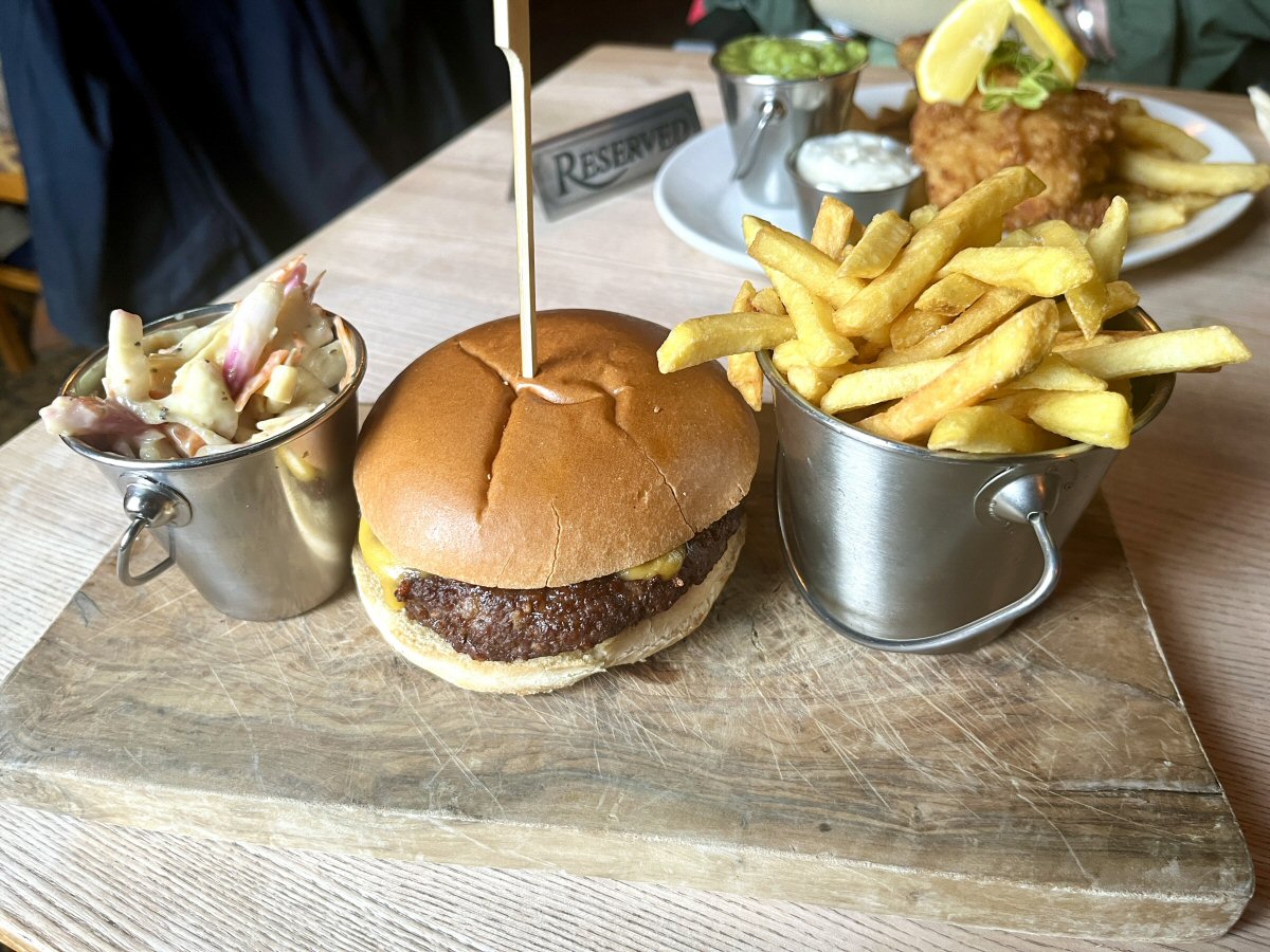 Sara had kindly reserved us a table with easy access for the wheelchair that we were using; so whilst I was stowing it away and yapping to Sara, His Nibs went to the bar and ordered our drinks. Having quenched our initial thirsts, we had a look at the menu and I picked out what I was having for my lunch straightaway: that’ll be the local Crab Sandwiches on brown bread with Salad and ‘Slaw (£14.95), please. Unusually, The Man went for Holy Island Fish n Chips (£18.95): locally sourced Haddock in a Real Ale batter, with handcut Chips and Minted Mushy Peas, and there must’ve been something in the air, because Mummy also went off-piste and had the Manor Cheeseburger with Relish, ‘Slaw and Fries (£15.95).