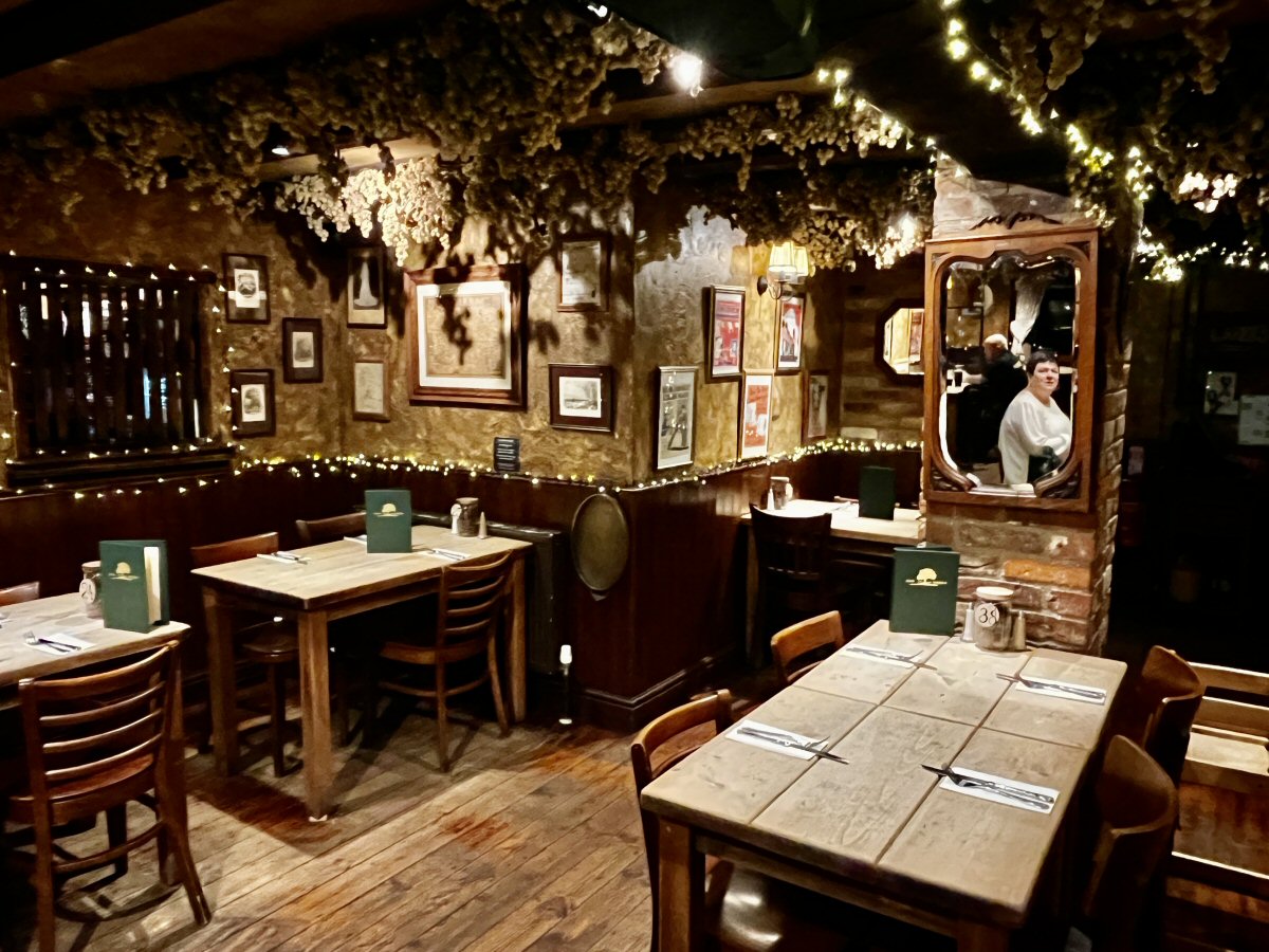 There was definitely more of a ‘heart of the village’ feel to ‘The Oak’ than there had been at its neighbouring pub; loads of chatter going on at the bar, dogs in the bar area (where you can still enjoy food), and generally just more ‘bustle’. However, I will just say that this was a Thursday evening [basically the weekend, no?], whereas we’d been to The White Horse on Tuesday; definitely different weekday feels. Lots of exposed red brickwork was in evidence, and I loved the garlands of Hops that were twining around the ceiling beams and an old ladder. Bits-and-Bobs decorated the windowsills and shelves around the restaurant, adding to its relaxed, welcoming feel.