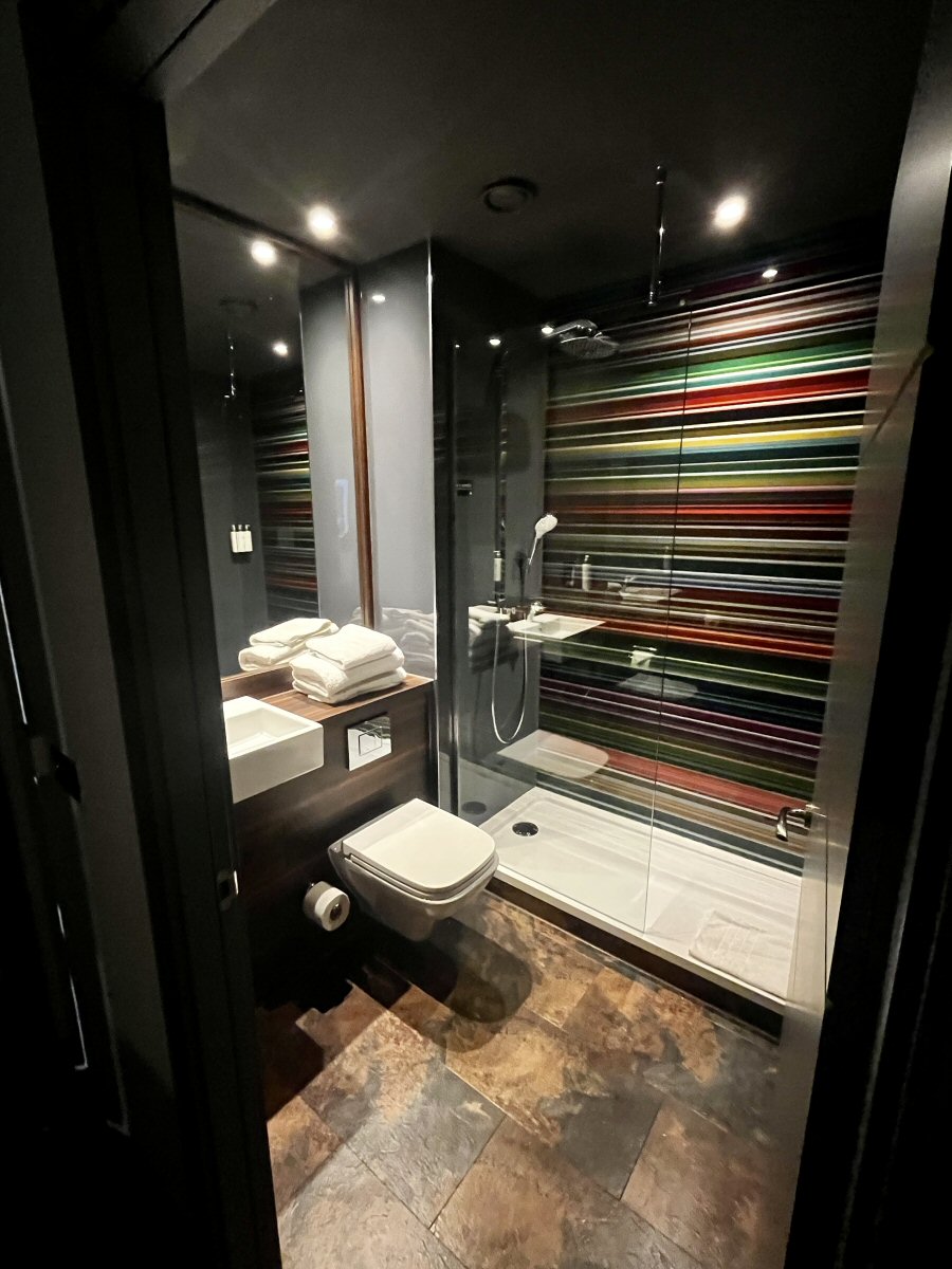 In the main body of the hotel, the decor is bright Turquoise and Grey, with striped carpet; modern, sleek and streamlined is the vibe. Personally, I wasn’t feeling the Turquoise, but I did love the Paul Smith-inspired stripe in our shower and behind the headboard of the bed. A nice striped carpet also added a pop against the plain walls. All your usual mod-cons were in place: tea/coffee making facilities, iron and board, hanging space for clothes and extra hangers, and a fan.