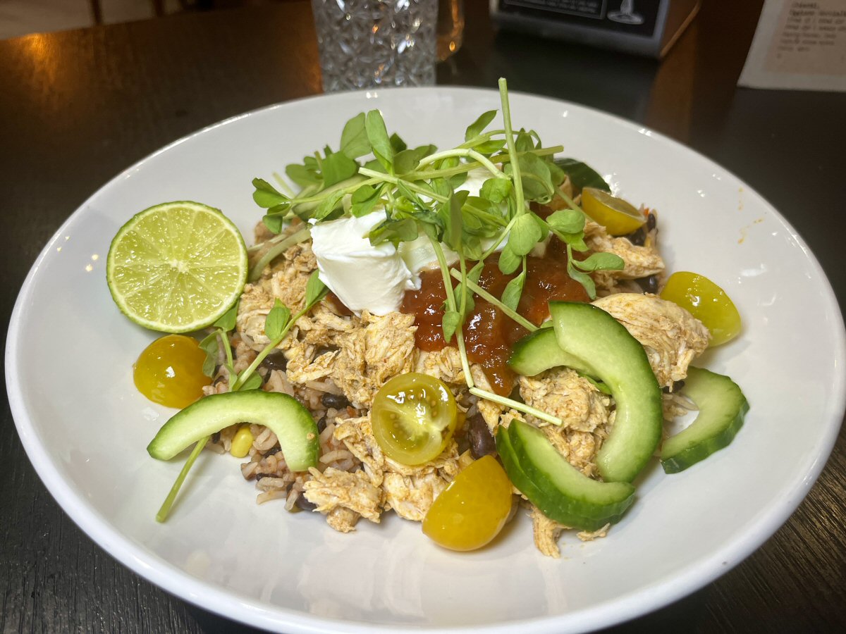 I was loving the plentiful shreds of Fajita-style Chicken that was the uppermost layer of my [fully heaped] bowl; succulent and tender, these protein-packed ribbons were pimped with spices that gave a gentle hum on the palate. A medley of Black- and Brown- Rice, roasted Corn and Salsa provided a hearty hit of carbohydrates (and fibre), with the Pea Shoots, Cucumber and Cherry Tomatoes helping me hit my 5-a-day target. Soured Cream and Avocado gave some fats and oils to the meal, so I think this is a pretty well balanced food offering; put it this way, I felt no guilt whatsoever as I munched my way right down to the last scrap of it!