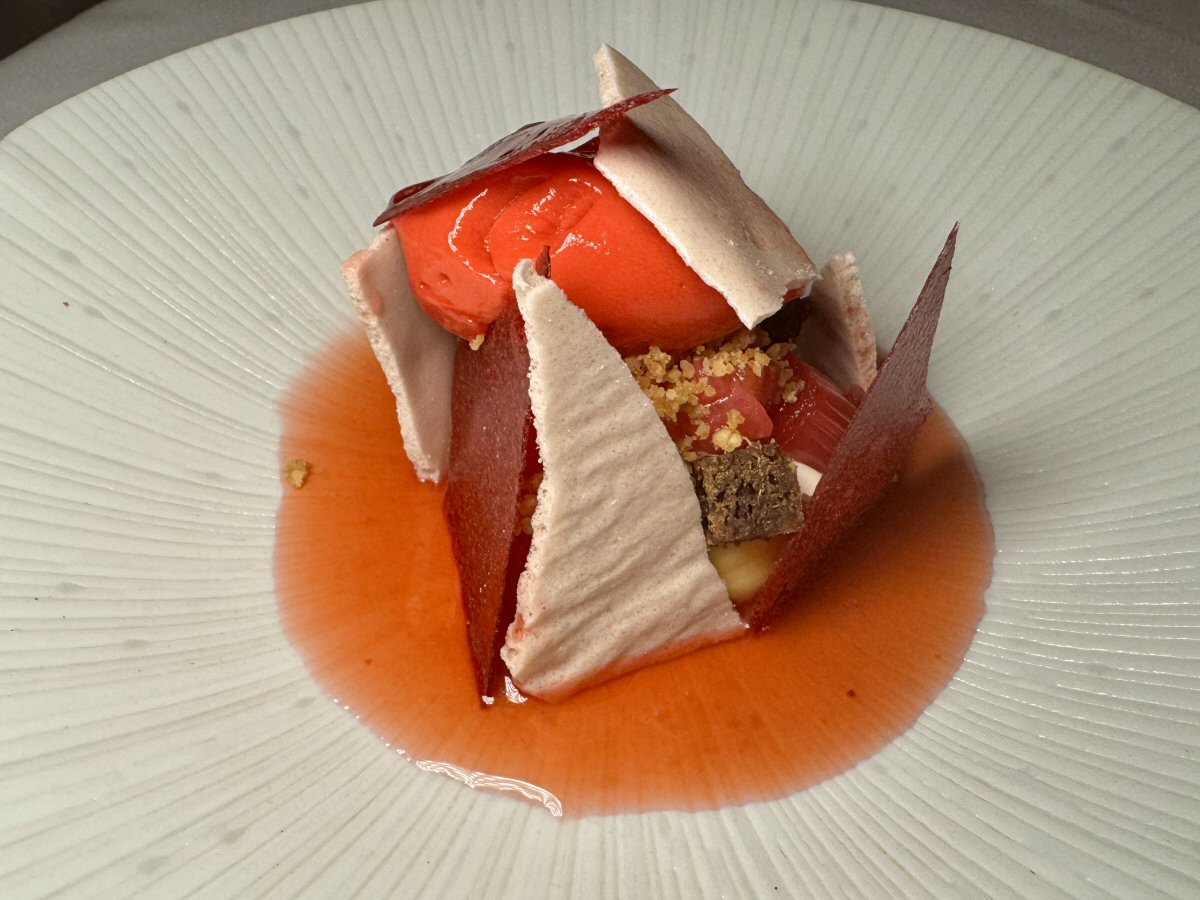 Oh, the Rhubarb! If you don’t already know, I have been stanning/fan-girling/obsessing over Rhubarb since probably forever. I’ll eat it raw, straight from the garden, cooked, hot, cold, frozen; basically, in any edible form! I’m just going to say that if you sit on the Rhubarb appreciation fence, this dessert will tip you over into the fan club. Sharp and clear, yet alluringly fragrant, the Rhubarb was augmented perfectly by two spices: Cardamom in the airy Mousseline, and Ginger in the tiny cubes of cake and partnering the fruit in a compote. Over my lifetime [so far], I’ve had literally hundreds of puddings and desserts, but this may possibly be my favourite Rhubarb one. Magnificent is all the description I have.