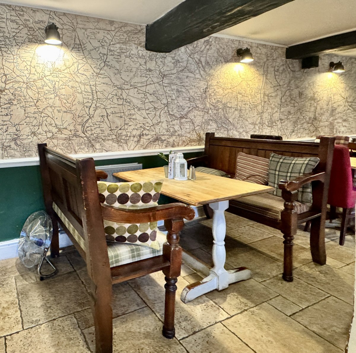 Whilst we waited for our food, I had a good gleg around; there is a definite nod to a more traditional feel, with dark ceiling beams, shades of green paint on the walls and a grand, blown-up map of the locale dominating one side. Lots of rural prints adorn the walls and lighting is sturdy modern (but no nonsense) metal types. Seating came in a variety of guises: mid-back benches, free standing chairs and a magnificent, Chesterfield-type sofa/banquette that ran pretty much under the windows down one side of the area.