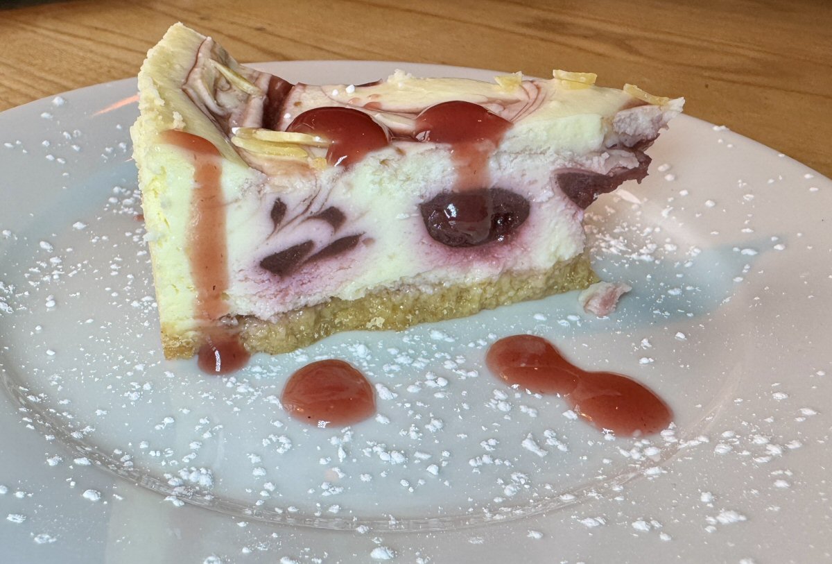 Nothing makes me smile more than when I get a proper wedge of Cheesecake, and this was certainly that. The base was buttery and pleasantly firm to cut into - no crumb disintegration here, thank you – and the body was possibly one of the prettiest I’ve seen. Predominantly pale Vanilla in tone, the top was attractively swirled with Cherry sauce and scattered with flaked Almonds, and within the centre there were pockets of whole Cherries and Coulis. Matching its exquisite appearance, this sweet delight was ruddy tremendous; seriously, this was one of these ‘if Carlsberg did…’ desserts.