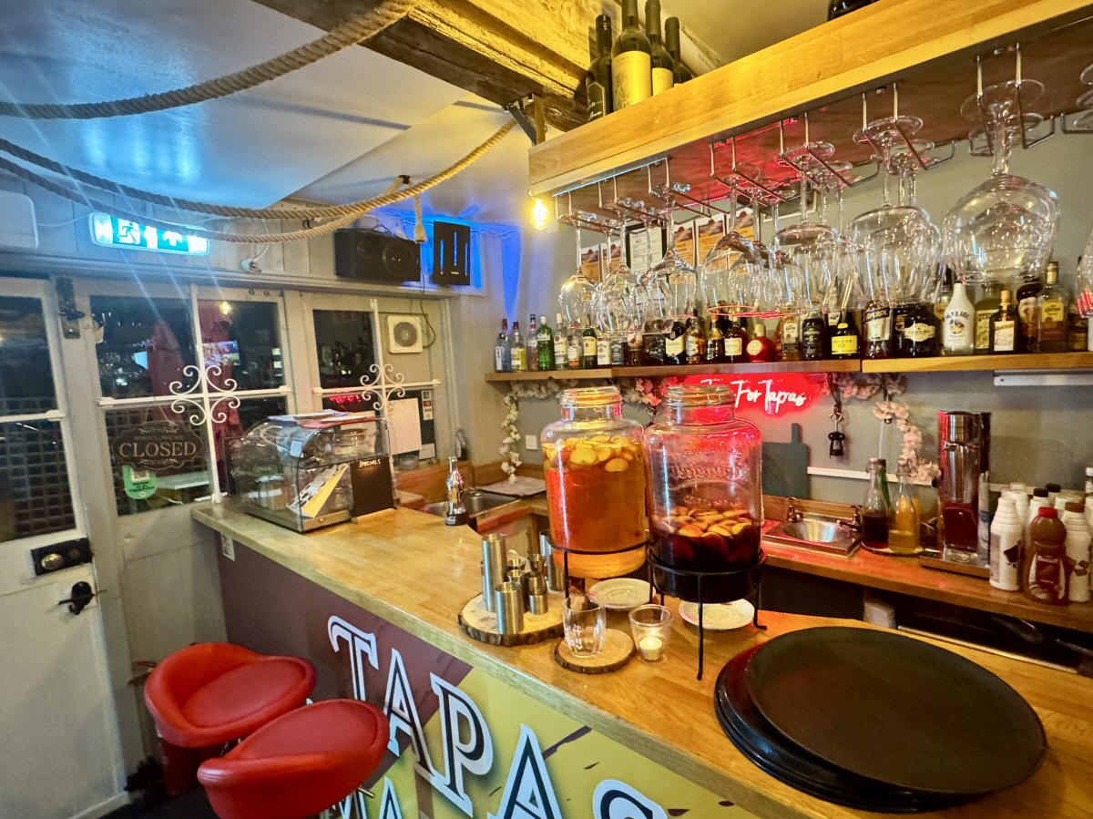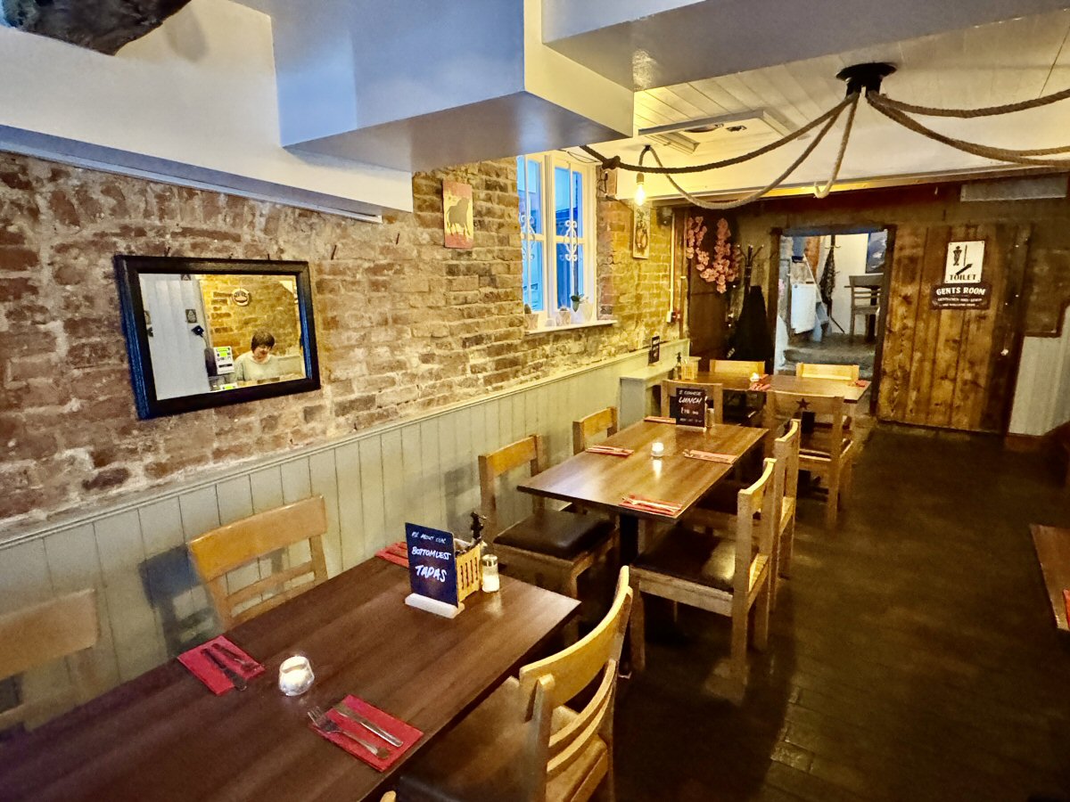 Inside, the venue is a type that I affectionately call a ‘Tardis building’; it is fairly narrow but its various areas reveal themselves like the layers of a Russian Doll! The red brick walls, dark flooring and low ceilings all combine to provide a cosy, cocooning feel, assisted by warm-toned lighting and flickering tealights on the tables. Upstairs, there’s a room that is perfect for larger parties (up to about 14 people) and gatherings.