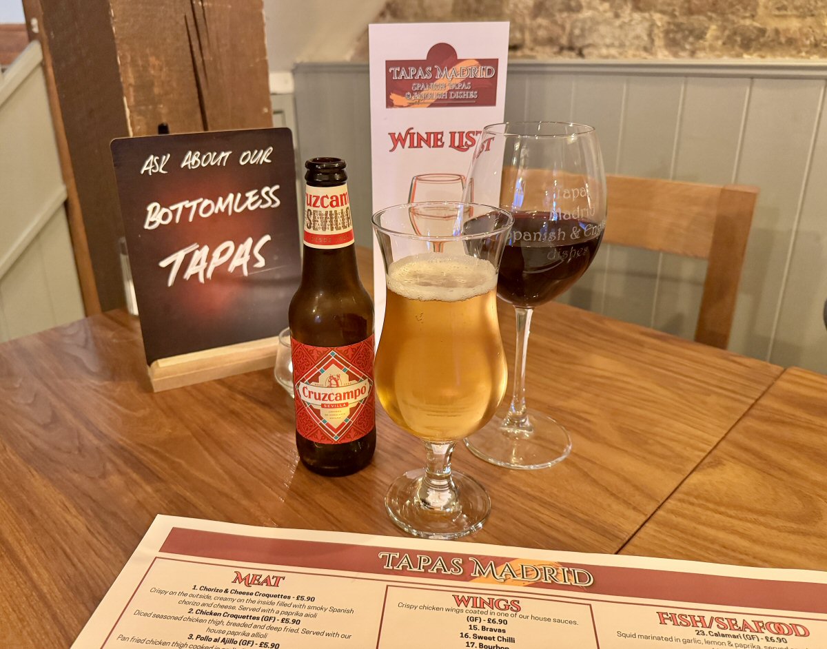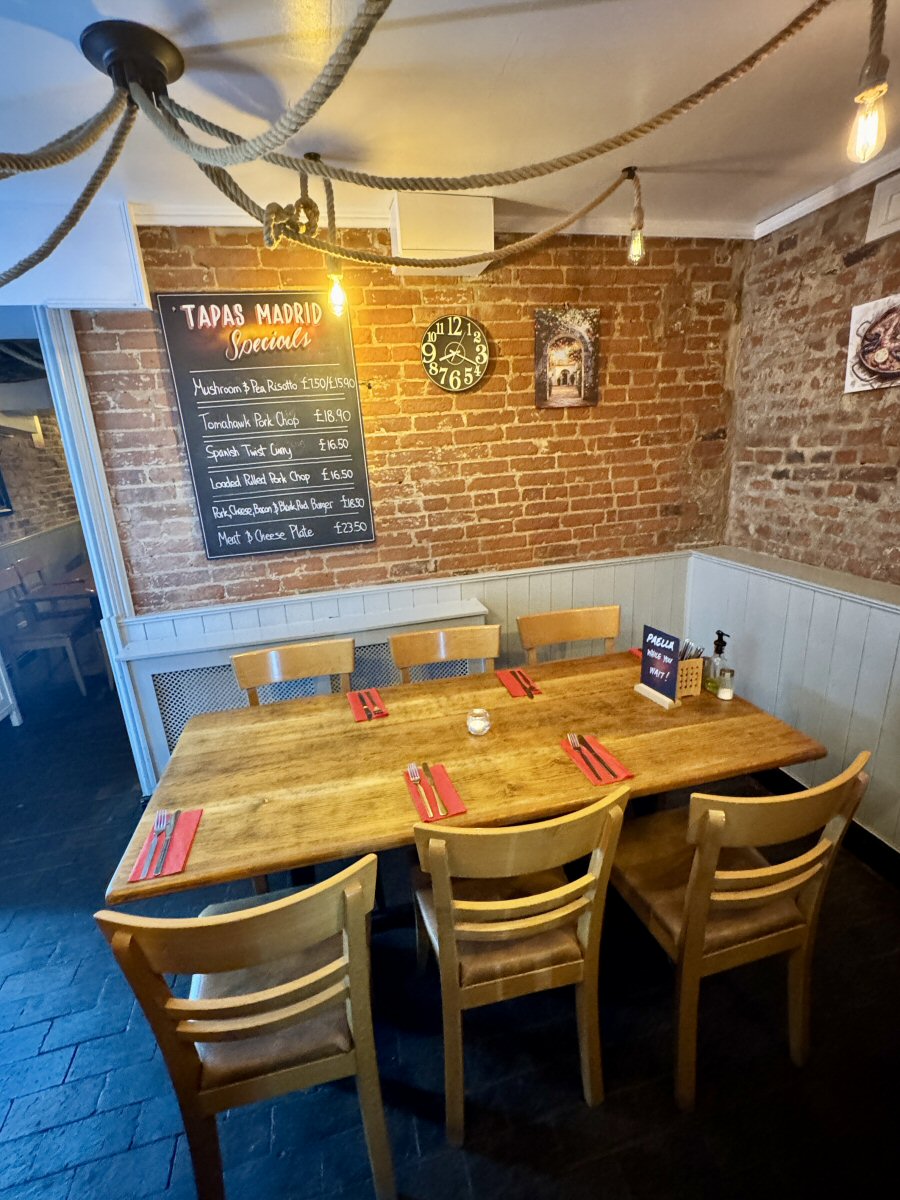 Over the years, we’ve met many a lovely manager, and Mark is no exception. Having previously been at the Moon and Dog pub in Derby, and at another venue in Ashbourne, Mark is now at the helm of Tapas Madrid in Ashbourne and kindly invited us along to sample the flavours of Spain. We parked nearby and walked up the jitty to Tapas Madrid (formerly an Italian restaurant), impressed by the outdoor seating area and colourful mural on the wall that announces its presence.