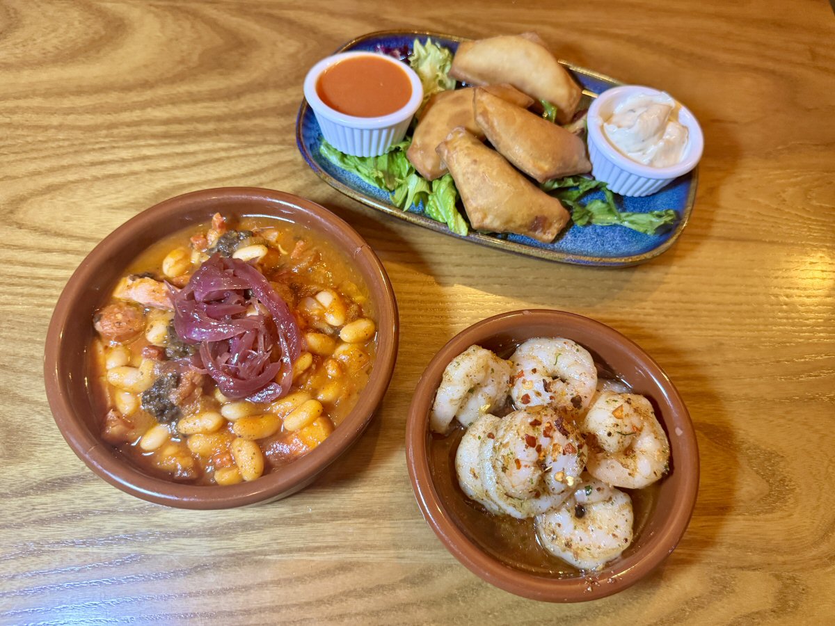 With the plates cleared away, a lovely young server brought out the next three temptations: Gambas Pil Pil (£6.90), Empanadillas de Pollo (Chicken Empanadas, £6.90), and Fabada Asturiana (Asturian style Stew, £6.90). Like the Patatas Bravas, the Gambas Pil Pil is a cornerstone of any self-respecting Tapas restaurant and these ones were excellent. Fat, juicy King Tiger Prawns lazed in the Chilli and Garlic Olive Oil that they’d been cooked in (with flakes of freshly ground Chilli topping them, because you might as well go all-in, y’know?!) and the fusion of fire and sweet was marvellous. His Nibs and I both reached for some more bread to soak the flavoursome oil up with, keen to get every last bit of it.