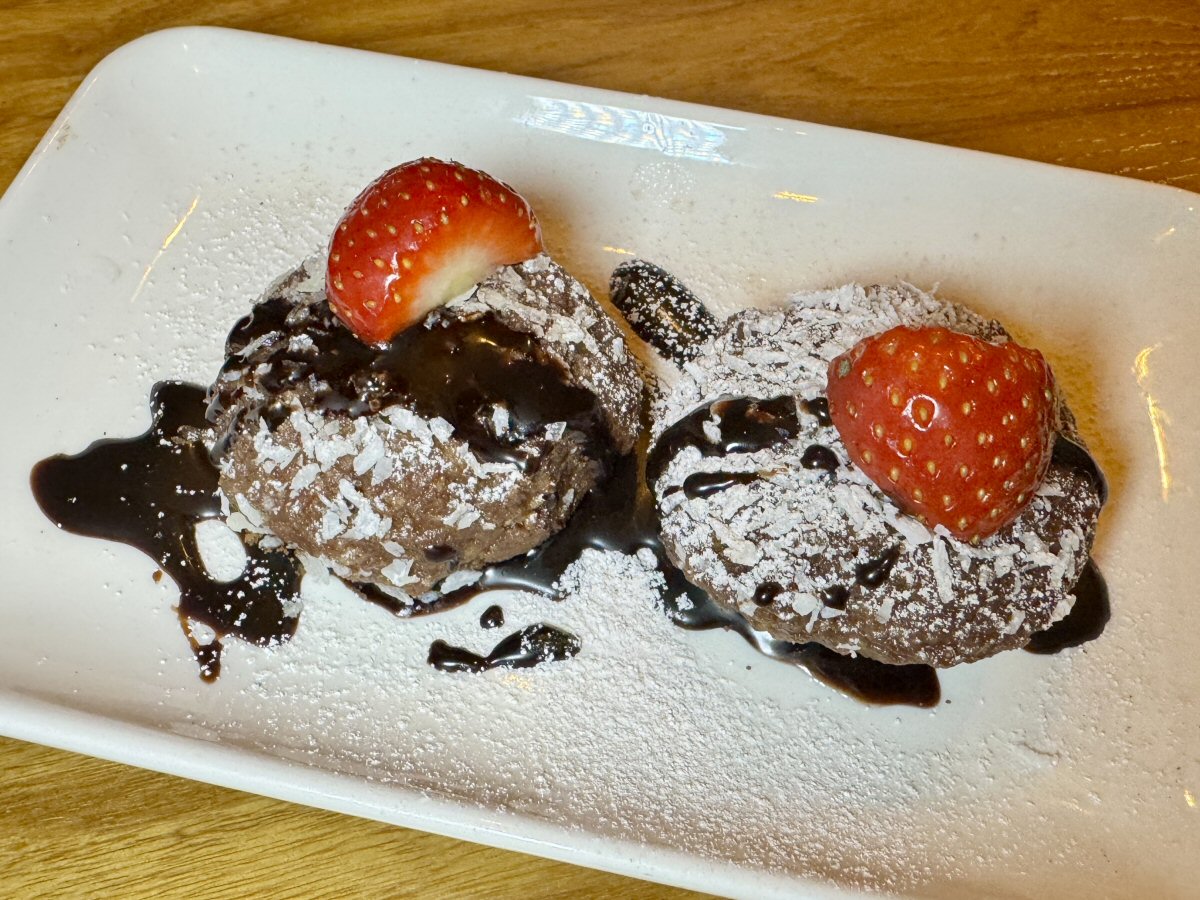 I wouldn’t say that they particularly resembled Hedgehogs, but they were so bloody delicious that neither of us cared! The nearest I can describe this treat is like a grainy Marzipan in texture – but chocolatey. Impossibly rich, sticky and moist, the dark ‘body’ had a desiccated Coconut outer coating (which I guess gave it a slightly spiky appearance), making for a tooth-tinglingly sweet dessert. A dark chocolate sauce was drizzled over and around the ‘hedgehogs’, though it wasn’t really needed to make this sweet treat any more indulgent. I would definitely opt to share one between two people…unless you want to get a dizzy sugar-rush! This wasn’t the only unique dessert Tapas, either: Sweet ‘Salami’, anyone?