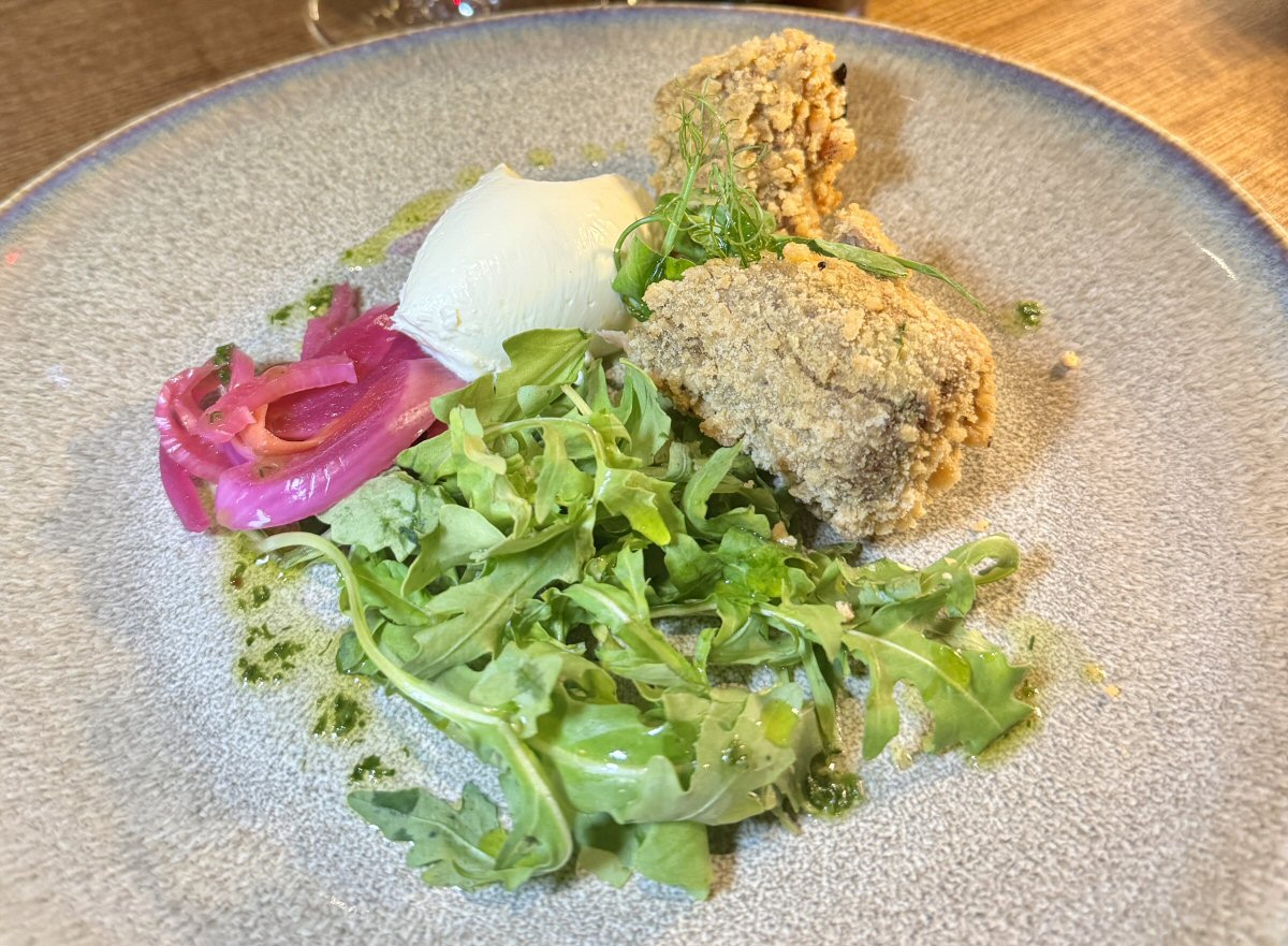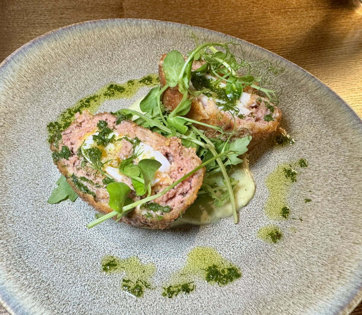 Our starters soon arrived and were both presented beautifully, with plenty of visual appeal evident. His Nibs’ Scotch Egg was a really good size, instantly making him smile, and his smile only intensified as he took the first mouthful. Under the superbly crisp, crunchy outer was a thick layer of coarser-than-usual Pork Sausagemeat, and this was zhuzhed with the exotic tang of Smoked Paprika, adding a marvellous depth of flavour to it. This meat layer wasn’t tightly packed either, and this actually allowed more of the taste to flood over the tongue, providing a better sensory experience. At the heart was a perfectly jammy-yolked Egg whose richness and creamy texture was stunning. Peppery Rocket leaves and the Herb Mayo added a wonderful bounce in the mouth, lifting the profile delightfully.