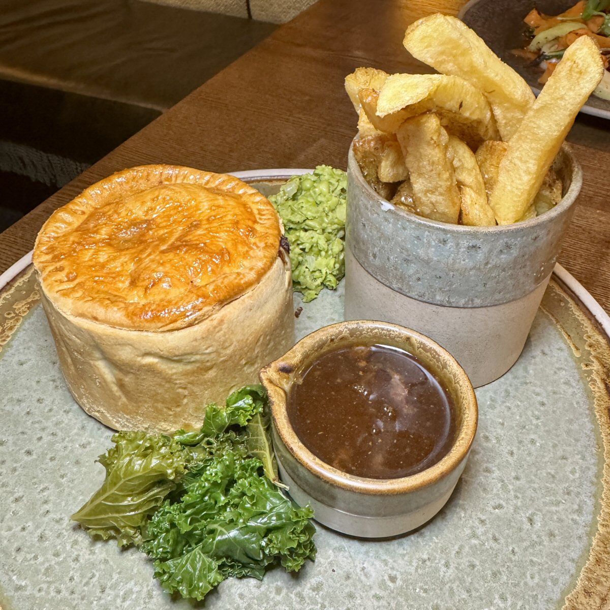 If ever there was a pie that was fully up to height (as horse folk say), this morsel was it: pastry fully encased the filling, and it was that glorious fat-rich pastry of the ilk that granny used to make – nom nom. The Pork pieces were plentiful and tasty, each one super-tender, and the Cider-pimped sauce’s fruity hint partnered the Pork perfectly. Over the years, His Nibs has [probably] had gallons of gravy but this one made his palate sit up and pay attention: a sultry smokiness glided over his tongue and had a gravity-defying depth of flavour to it. Needless to say, there was much dunking of chips into the jug of this fabulous stuff! Bringing a lighter tone to the dish were the beguilingly sweet crushed Peas, and they really were delicious: proof again that simple things can often be the crux of a dish.