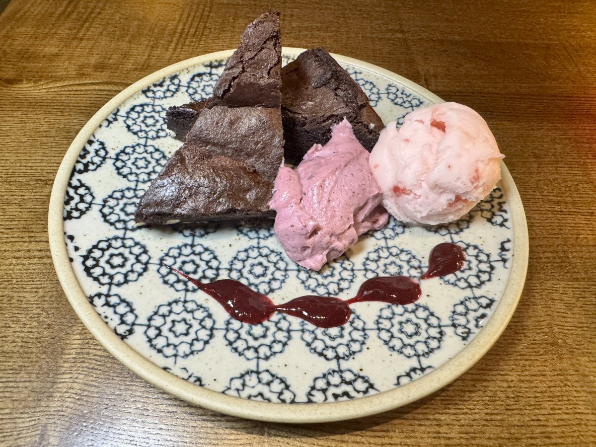 Wonderfully dark, cocoa-heavy Brownie had been cut into triangles for presentation and their richness lit up my brains’ pleasure centre like Oxford Streets’ Christmas lights. The gentle crust revealed a pleasingly gooey centre when cut into, at the bottom of which was a scattering of White Chocolate drops. A stunning, marbled Berry Mousse proved to be an able distraction from the Brownie, its zingy taste dancing on my tongue gleefully. The Sorbet was refreshing and light, its coolness standing out proudly, and as if there weren’t already enough stand-out parts of this dessert to swoon over, the jewel-toned Coulis of Fresh Berries brought their energy to the party. This was the dessert of dreams, for sure!
