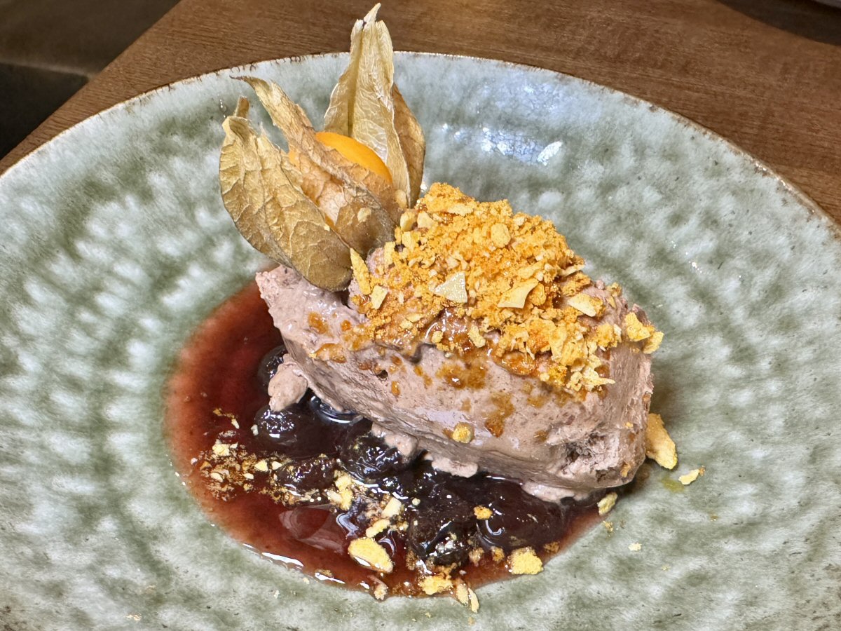 You can stop at two courses but, for an extra fiver, why would you? I decided to conclude my meal with the Chocolate Brownie, Wild Berry Mousse, Marc de Champagne Sorbet and Fresh Berries, and The Man fancied the [vegan friendly] Dark Chocolate Mousse, Vegan Honeycomb, Dark Cherry Compote, and Fresh Physalis.