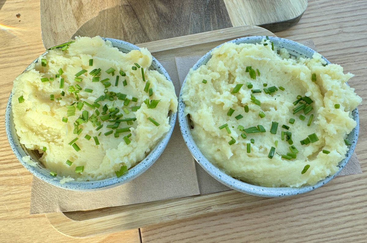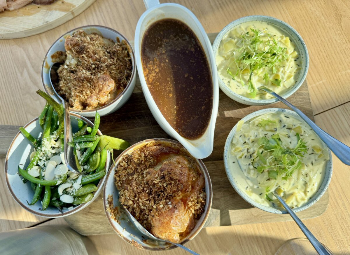 As well as the Lamb Shank (which was wonderfully rich in flavour and falling off the bone it was that tender, btw), there were thick slices of [served pink] Beef Sirloin, Pork Loin, Gammon, and a superb Confit Chicken Leg that was gorgeously crisp on its skin. Needless to say, when the team popped the sizeable wooden blocks down, we all acted as if we’d been stranded on a desert island for years with no food! A flurry of activity saw everyone get their share of all the meats, as well as a divvying up of the plump, luscious Honey-glazed Pigs-in-Blankets, crisp Garlic and Rosemary-zhuzhed Roasties, Buttery Mash, Maple and Thyme-glazed Roasted Carrots and Parsnips, Tenderstem Broccoli, Creamy Parmesan Leeks, and lavish Cauliflower Cheese. Even the Greens are extra; Mange Tout and Fine Green Beans come with a flaked Almond topping – yum.