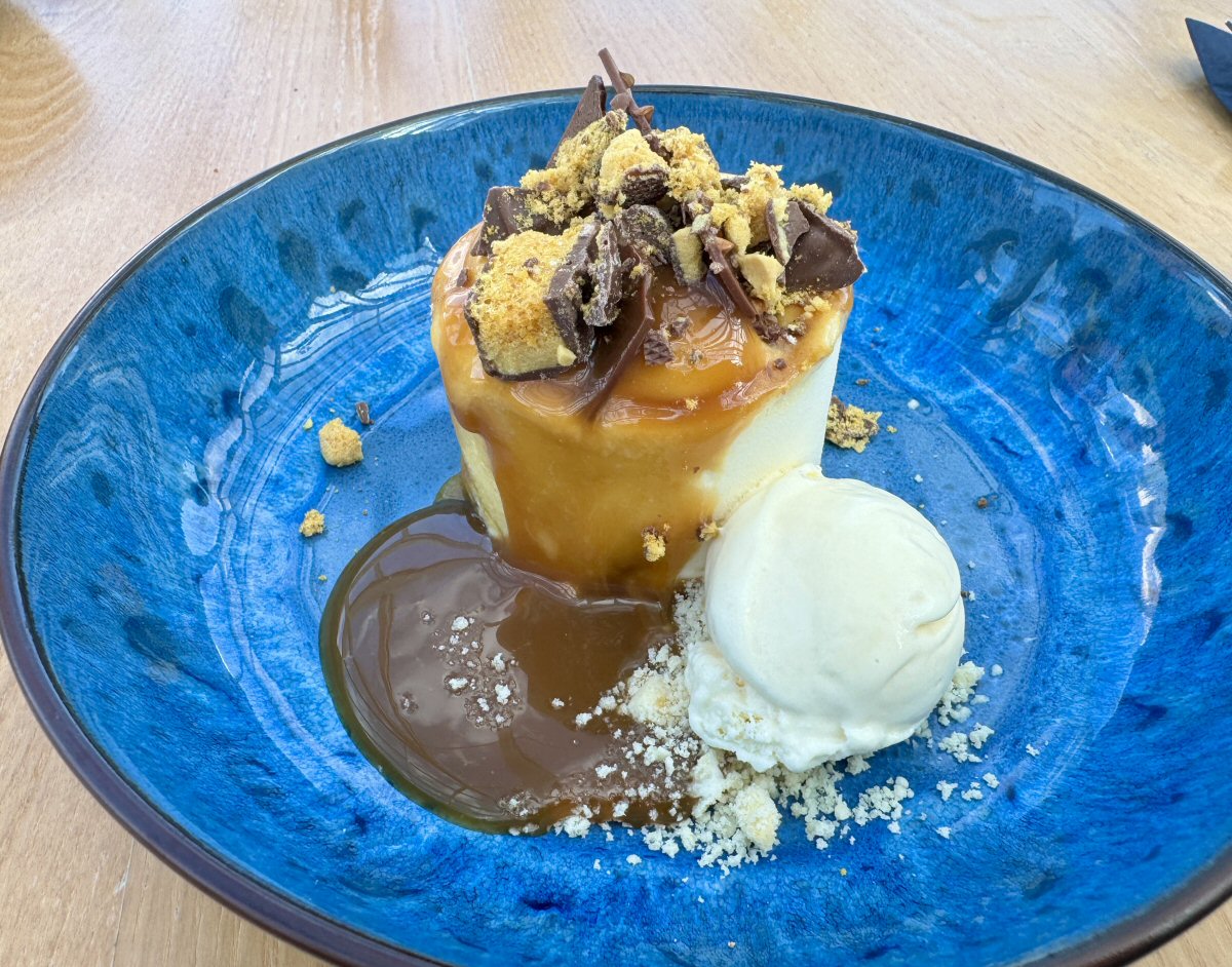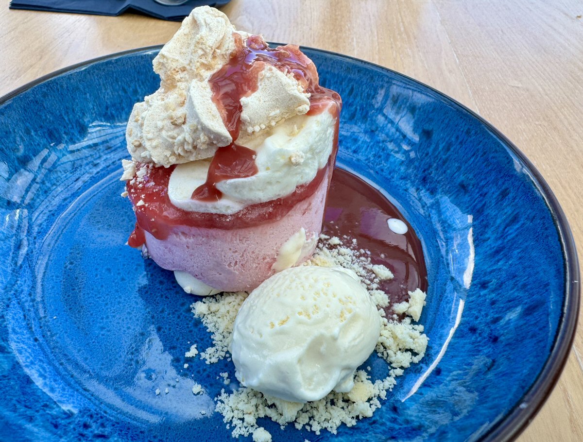 Having cleared our table of all the plates, boards and accoutrements, our server returned with the dessert menu. Priced at £6.95 each, there was plenty of choice to pick from and Mummy Bird, The Man, and myself were soon mulling over what we fancied. I went for Raspberry Pavlova (Tom’s interpretation of it), The Man was won over by the Salted Caramel Mousse, and Mummy opted for the Sticky Toffee Pudding. Neither The Beau or Fledge wanted pudding, so they said their goodbyes and went home.