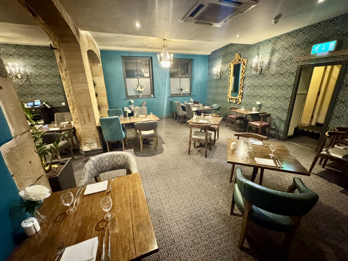 The Coach House is pet friendly in one section of the restaurant, and is child-friendly throughout. I loved the exposed stone walls, and the twinkling chandeliers that add to the elegance feel of this setting. Huge, gilt-edged mirrors reflect the light around and amplify the amount of floor space, and a splash of colour is injected by the Art Deco-inspired, teal and gold feature wall paper on one wall. The floor was pale wood, its muted tone echoed by the tables and mid-back chairs.