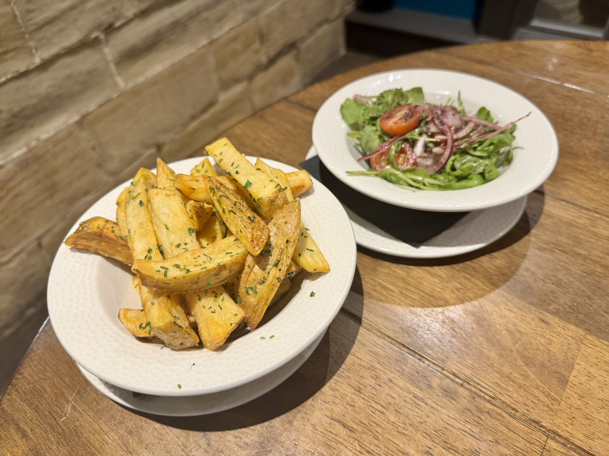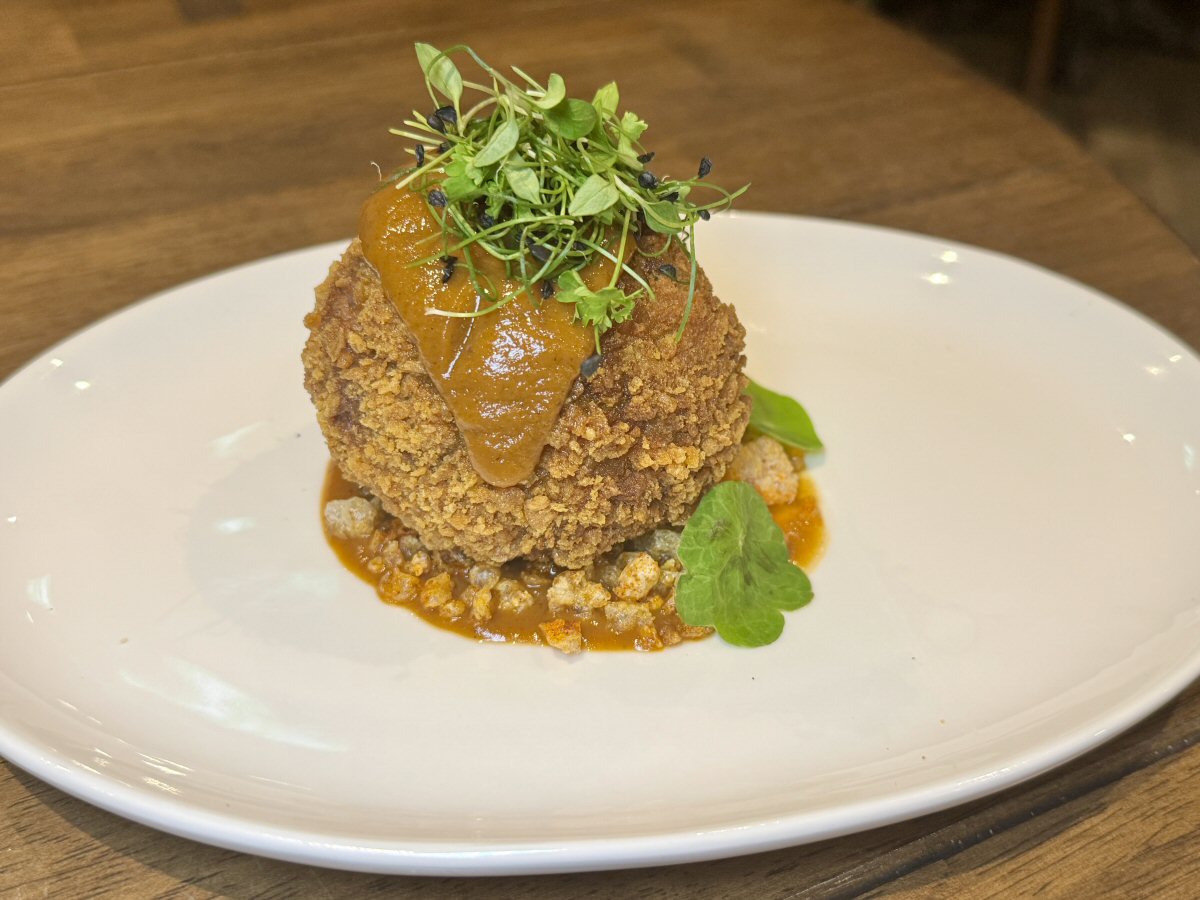 Although not vast, the menu certainly offered a great range of choice; to start, I chose the Gravadlax (£11.95) and His Nibs opted for the Hot Scotch Egg (£9.95). For mains, I ordered Seafood Arancini (£29.95), The Man fancied the Chef’s Chicken Cordon Bleu (£24.95). We also opted for a couple of sides: Salad, and twice-cooked Chunky Chips, both £3.95.