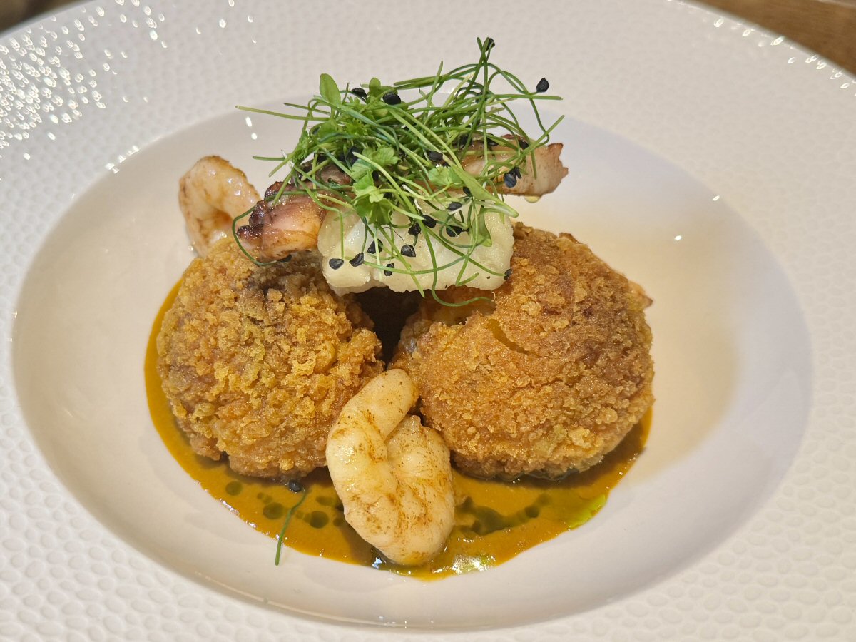 Whenever I’ve had them, I’ve always enjoyed Arancini, though I‘ve never had Seafood ones. The trio of sizeable spheres were a good size and each had an irresistibly crisp, golden outer that contrasted with their soft contents. Perfectly cooked rice had been combined with pieces of King prawn and Chorizo to form the ‘body’, and the flavours swirled seamlessly over my palate; I savoured the marriage of fragrant seafood and punchier Chorizo, and the balance was executed skilfully by Chef. Possibly the most flavoursome Crayfish bisque on the planet provided a luxuriant bath for the Arancini, and I have to say that this was an utter joy to taste! Both the Calamari and grilled Octopus were superb, neither had been over-cooked so their softness lazed in my mouth.