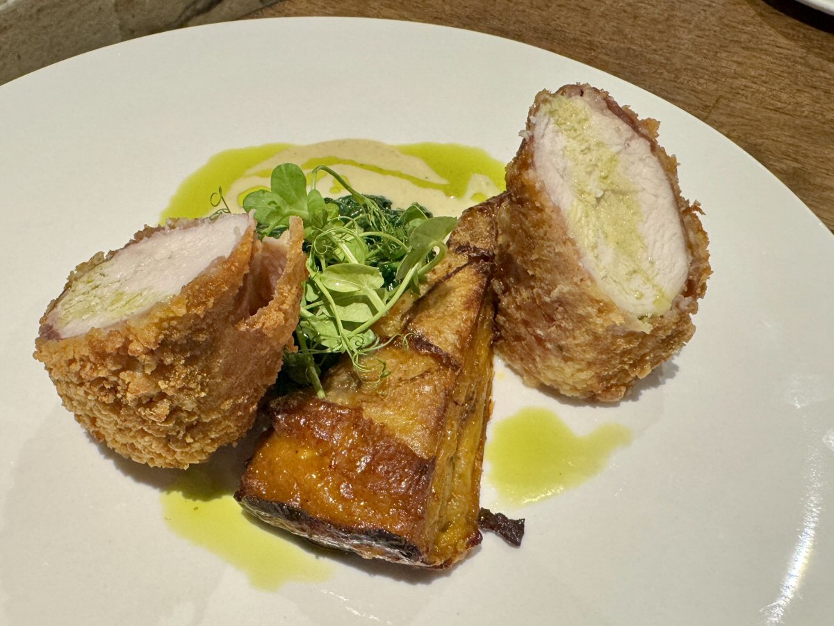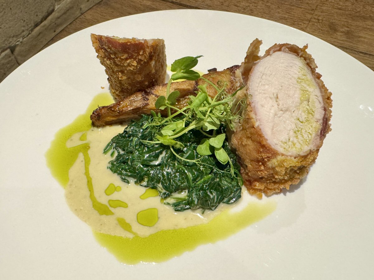 His Nibs was more than happy with the initial impression of his Chef’s Chicken Cordon Bleu; served cut in half on the angle, this was serving major visual appeal. The chicken breast itself was moist and tender with its Pangrattato (fancy breadcrumbs) coating being golden and crisp. At the very heart of the chicken was a delightfully silky Bechamel sauce, zhuzhed with Prosciutto, Garlic, Parsley, Chive and Cream Cheese - talk about muchos scrummy! Verdant creamed Spinach was soft yet powerful in The Mans’ mouth, and was the final element of the flavour wheel for this dish.