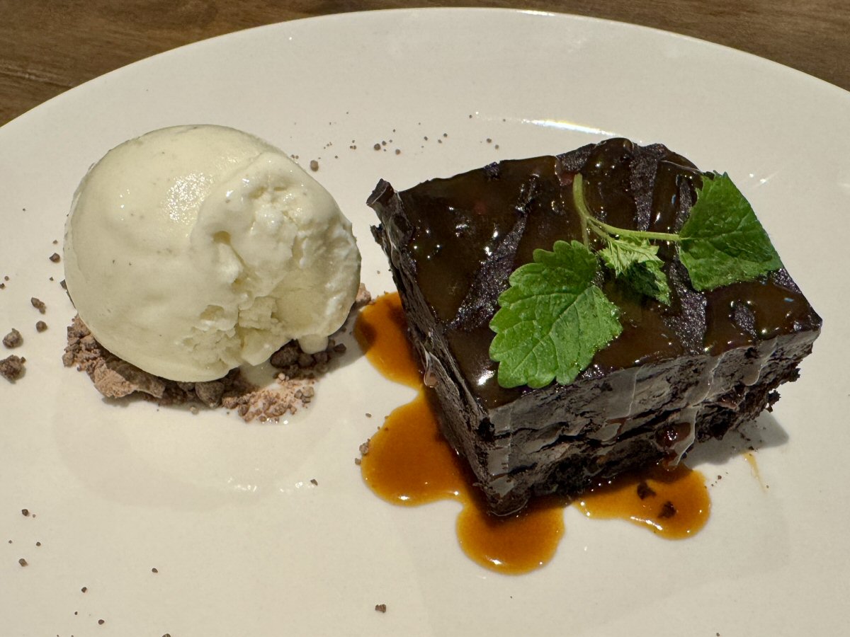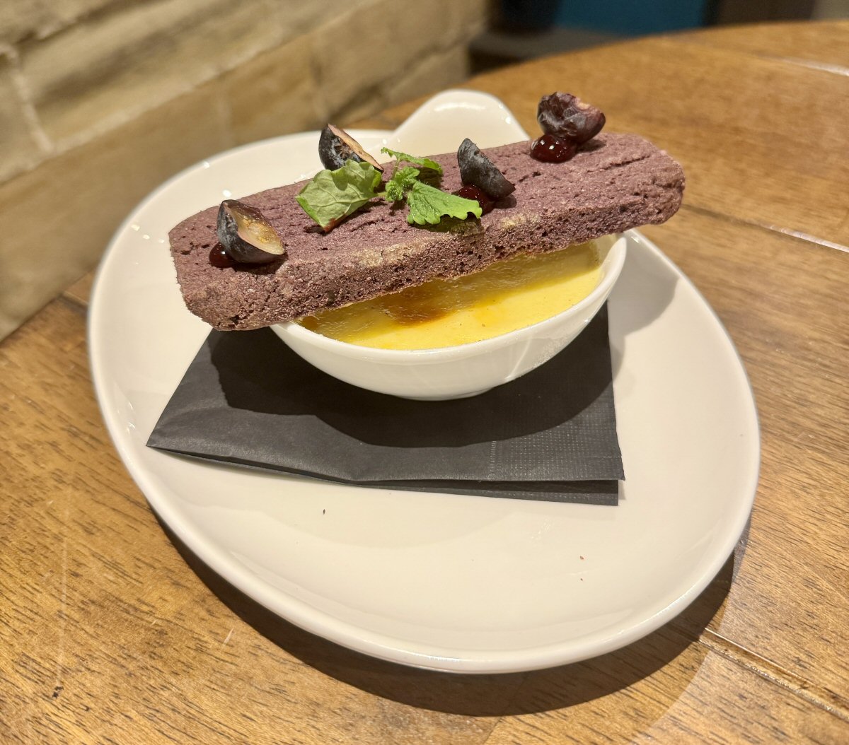 Feeling positive overall, we marched on and ordered dessert: White Chocolate and Lavender Crème Brulee for me; the Dessert of the Day (Chocolate Brownie with Caramel Sauce and Vanila Ice Cream) for His Nibs, both £7.95.