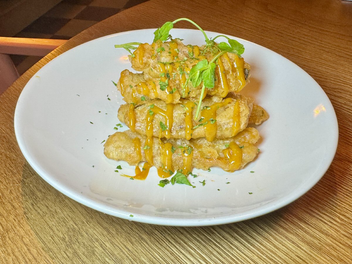 Having got us sorted with table water and a bottle of Malbec, Autumn left us to peruse the extensive menu. My initial thought was to forego a starter as I had decided to go for the Rib Combo (£28.99) for main and it sounded pretty sizeable with a trio of Rib types. Had His Nibs not stuck his beak in, my [admittedly weak] will-power may have won out, but when he announced that he was having the Smoky Bacon Bits with Crispy Belly Pork and Whiskey BBQ Sauce (£7.50) to start, I pouted and caved! To kick my meal off, I chose Frickles with Carolina Sauce (£7.50); don’t come for me, Gherkin haters, I just love ‘em. I never liked Gherkins when I was younger but I have come around to their charms and now won’t hear a word against them, ok?