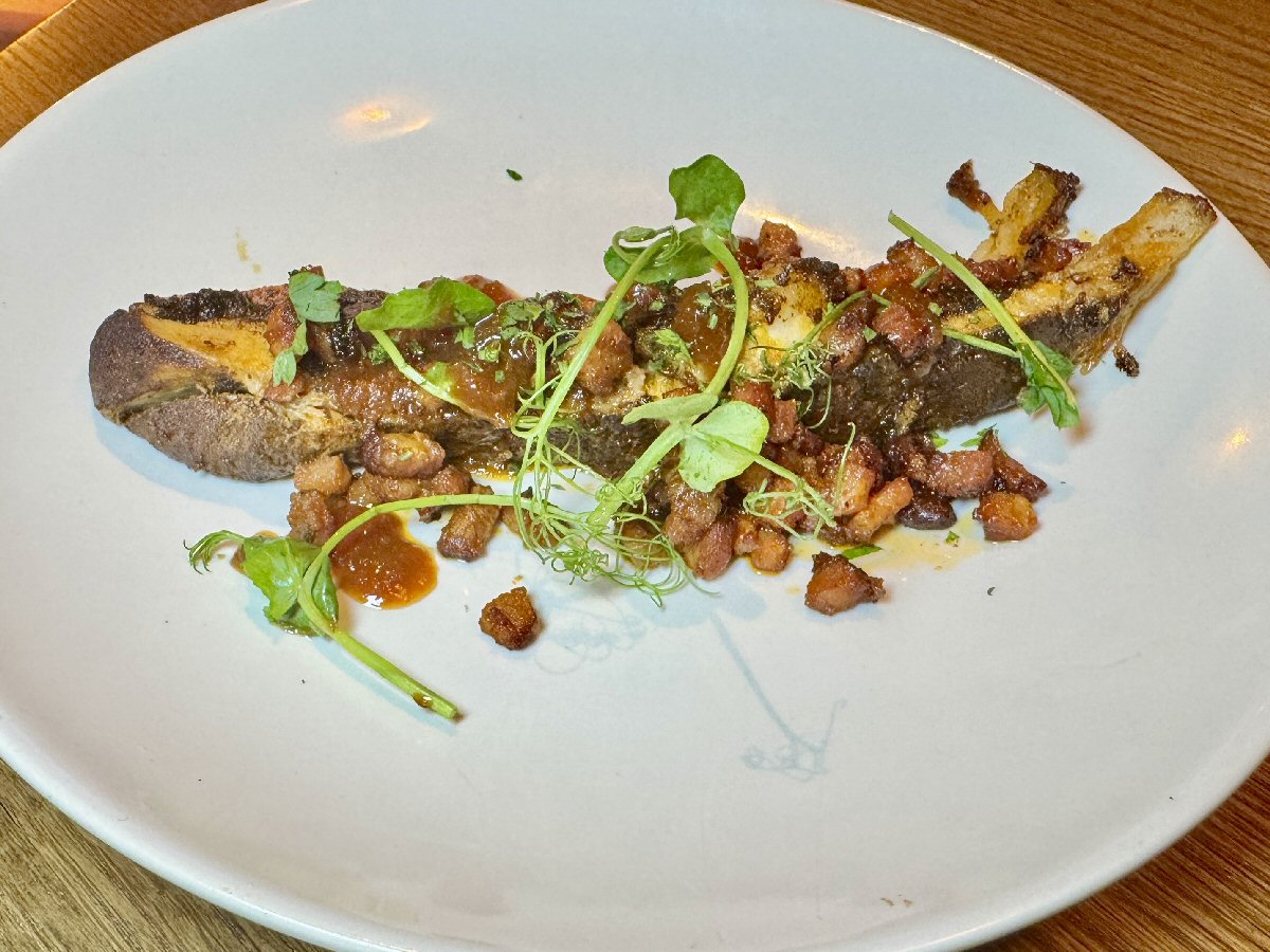 His Nibs had gone for the Brisket Plate (£22.99) as his main course, a mouth-watering dish of 18-hour smoked Beef Brisket with Carolina Sauce and irresistibly intense-tasting Burnt Ends. I could tell by the contented sigh that escaped The Man’s lips that the Brisket was hitting the sweet spot and it was clear from the tell-tale pink ‘smoke ring’ that no corners had been cut in the production of this juicy, tender delight. Unlike me, Mr Salad-dodger extraordinaire had opted to have the skin-on Fries and they were deemed to be wonderful; crisp outers and soft inners with a sweet nutty-but-earthy flavour.
