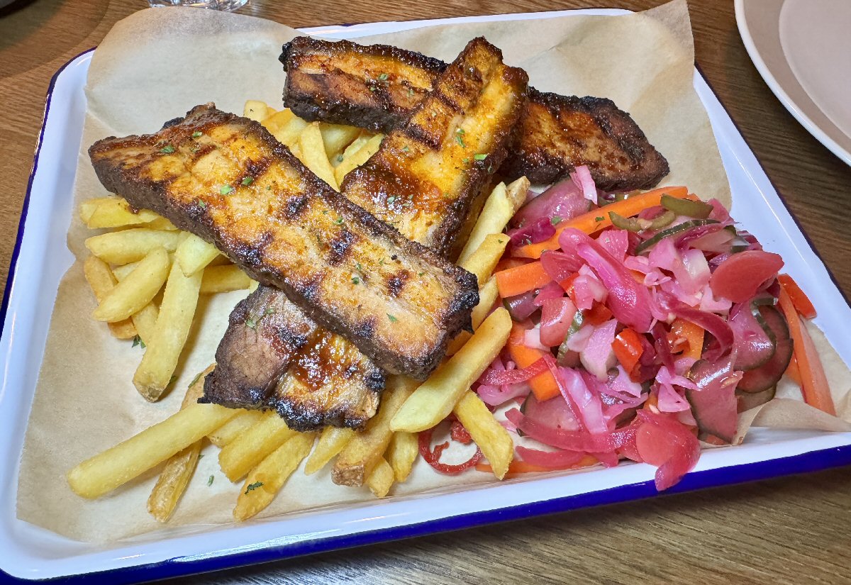 Clapping eyes on my Rib Combo platter, I knew we’d gone waaaaay beyond stretchy trouser territory and were firmly ensconced in ‘pass the kaftan’ country! Jeez, Louise, there’s huge and then there’s platters that are worthy of their own postcode; given the size of the ‘half rack’ of Pork Ribs, I’d be gob-smacked at a full one! You all know me, though: shoulders back, chest up, and let’s get cracking.