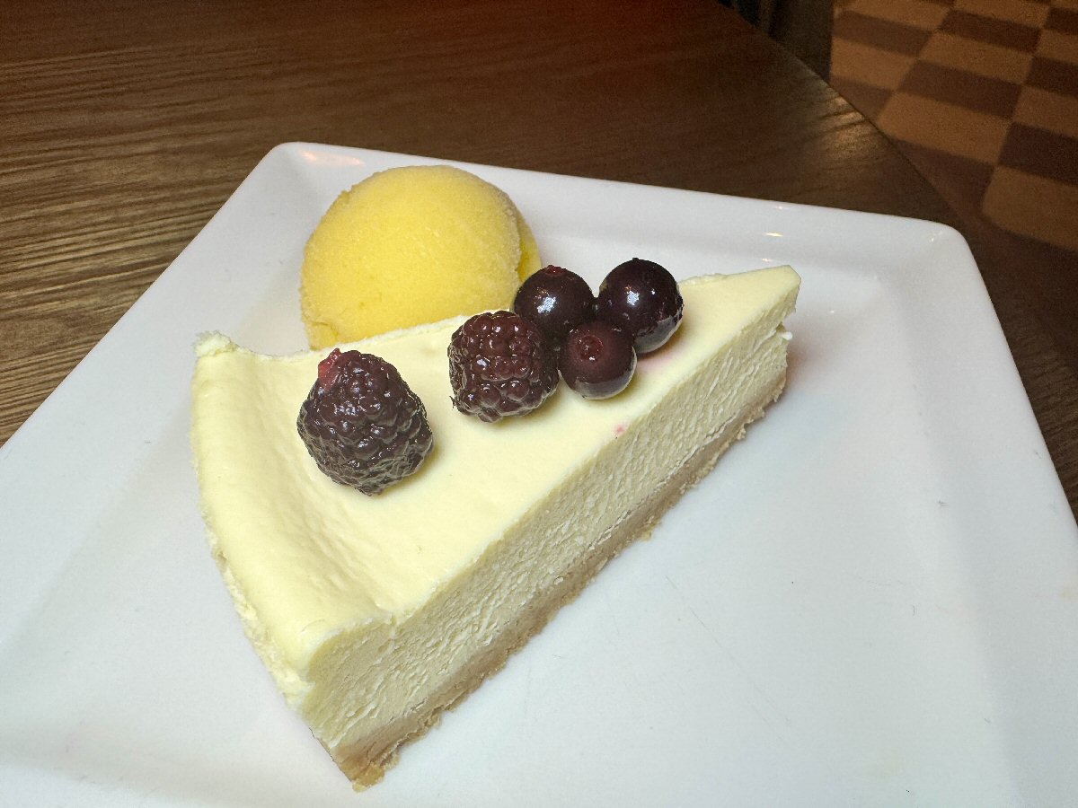 The Man Bird was pleased to discover that the base of his Cheesecake had that texture that renders it easy to cut into without it disintegrating into a thousand crumbs, and it was beautifully buttery on the tongue. Mellowly creamy, the Cheesecake body had a dense velvetiness that has you quietly weeping with joy, and then bringing you around from your food-swoon is a Passionfruit Sorbet that has a deceptive ardency to it. The fresh Mango was puréed, anchoring the Sorbet to the plate, and its bold, fragrant flavour provided a smooth ‘bridge’ between the other elements. As with my dessert, not a smidge went uneaten on The Mans’ plate.