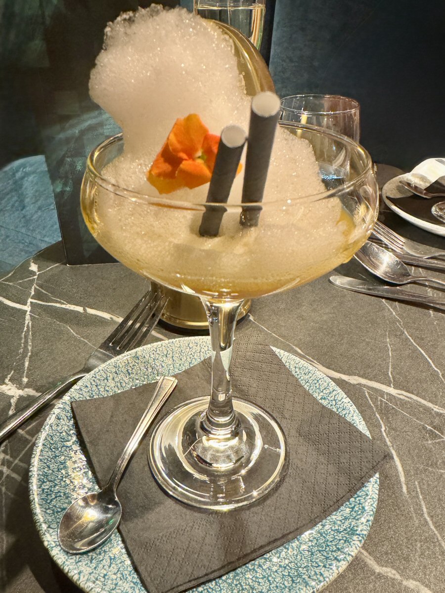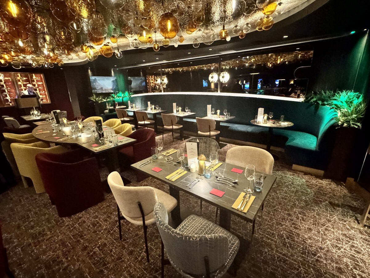 There was a little while to go before we were going to be seated for dinner, so I was able to indulge my light fetish…and there are some incredible lights here at Napoleons, let me just say! In the more informal area, there are booths shaped like Lilypads that are upholstered with an intense green-toned plush fabric and above them, a correspondingly shaped, hammered-metal ceiling alcove that diffused the light from the lamps on the tables. Quite beautiful, but not as dazzling as the lighting in the restaurant ‘proper’. Spherical pendants of all sizes and in harmonious tones of Amber, Cream, and White hung from a huge central recess, casting a warm glow over the larger group/party tables. Around the periphery were smaller tables, perfect for couples and quads, and these had the same plush banquette-style seating as the ‘Lilypads’. I have to say, Napoleons is a sleek venue that manages to combine high-octane vibes of the gaming floor without compromising on the ambience you’d expect in a fine-dining restaurant – no mean feat, but one the team have achieved with aplomb.
