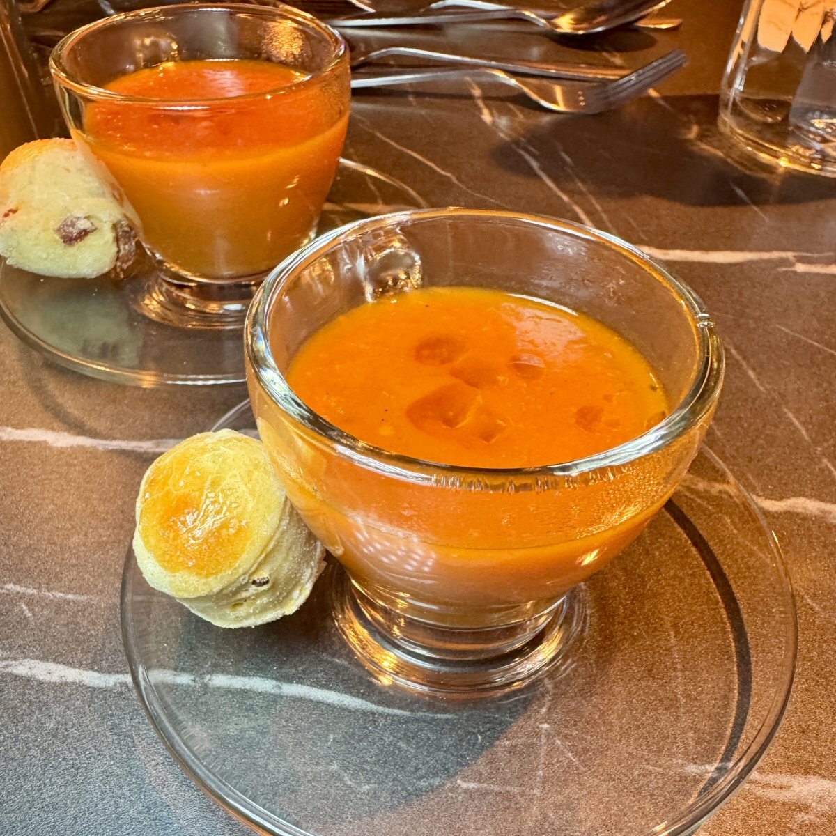 It was now time to take our places at our tables and wait for the serving team to begin bringing the first course out: a tasty-sounding Roasted Vine Tomato and Red Pepper Soup with Mini Chorizo Scone and Basil Oil. Each white-cloth covered table was set with gleaming cutlery, wine- and water- glasses, quality paper napkin, and a little surprise for each of us: red envelopes containing vouchers to use at the slots and discounts for future dining. This was a lovely surprise, thank you ‘Team Napoleons’.
